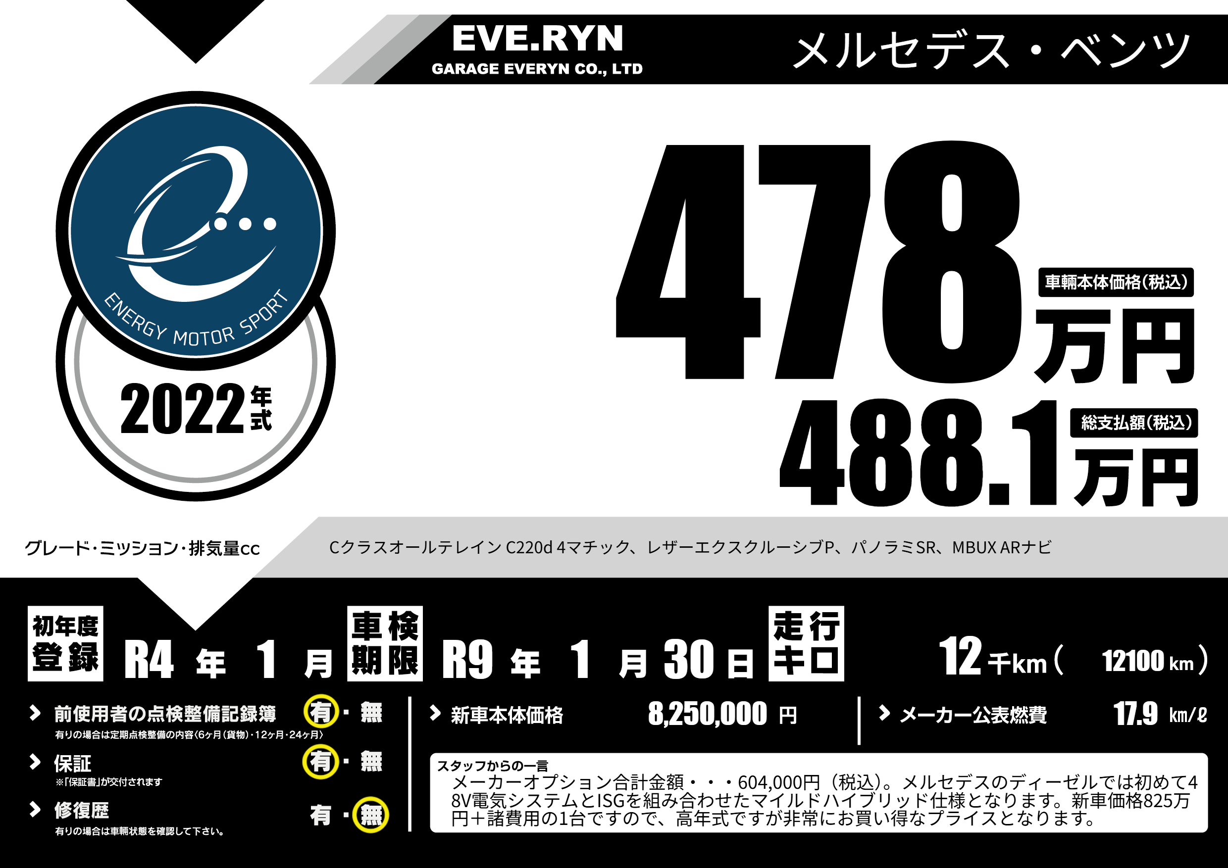Cクラスオールテレイン C220d 4マチック、レザーエクスクルーシブP、パノラミSR、MBUX ARナビ |