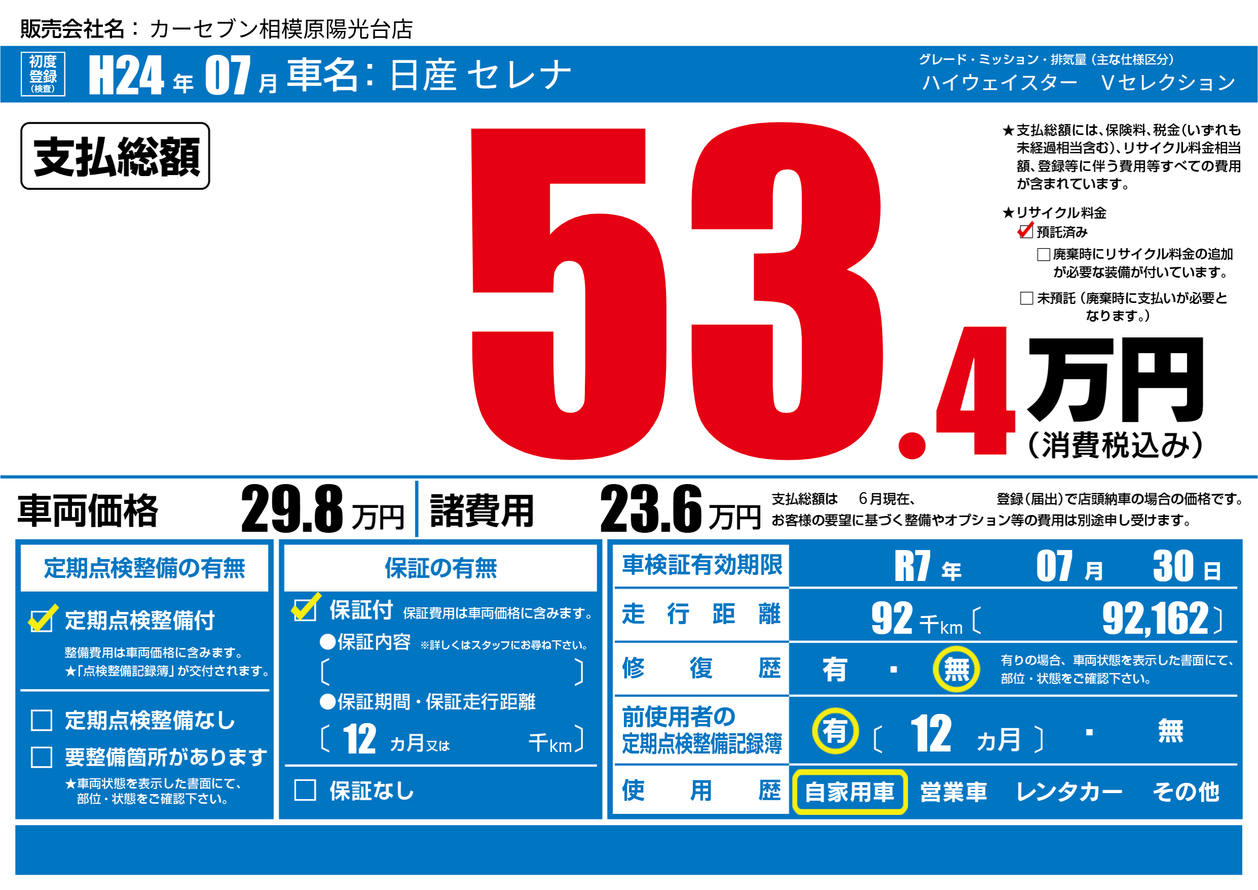 | 走行キロ | 9.2万km | 初年度登録 | H24年07月 |
