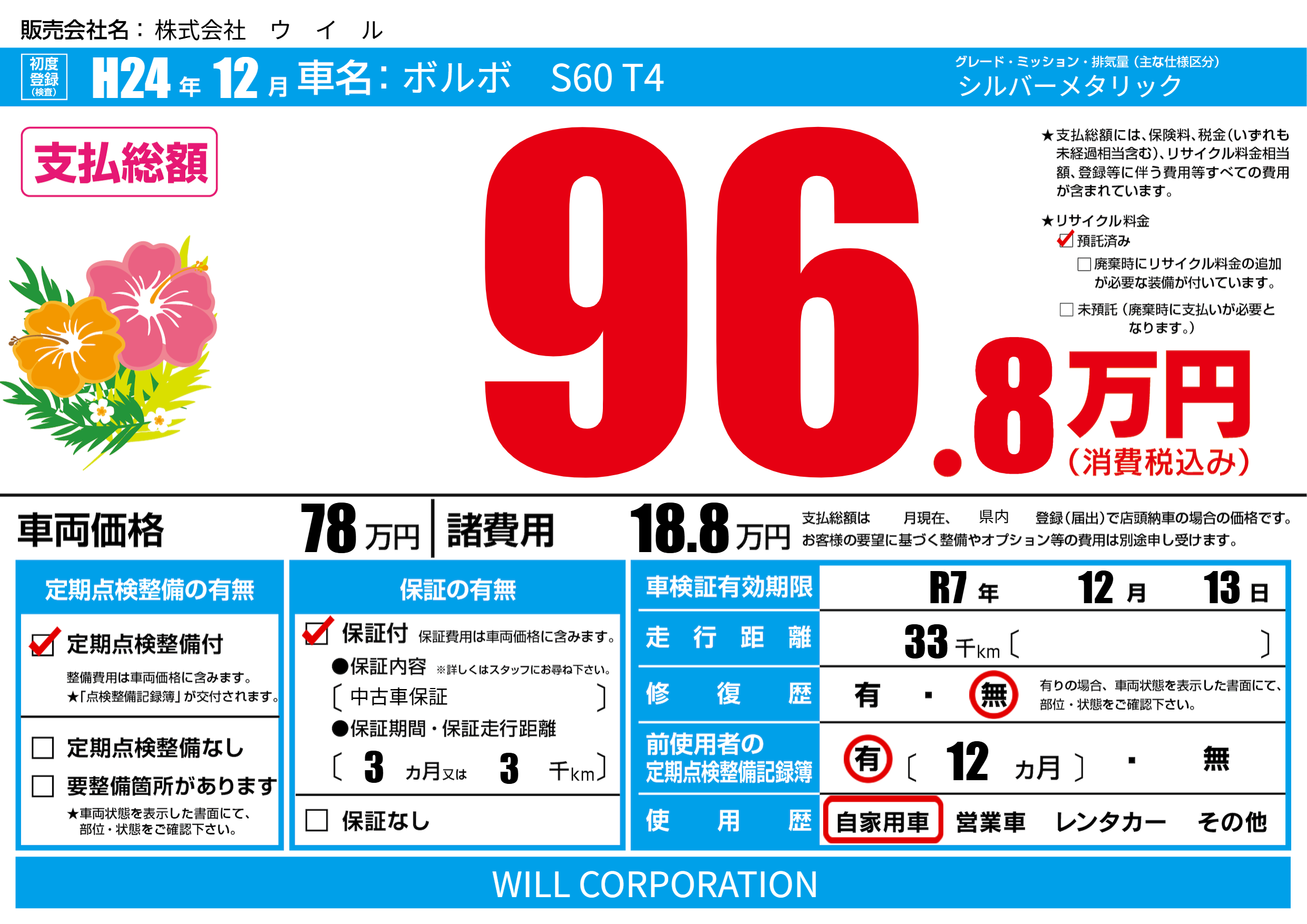 | 車名 | ボルボ S60 T4 | グレード ミッション 排気量 |