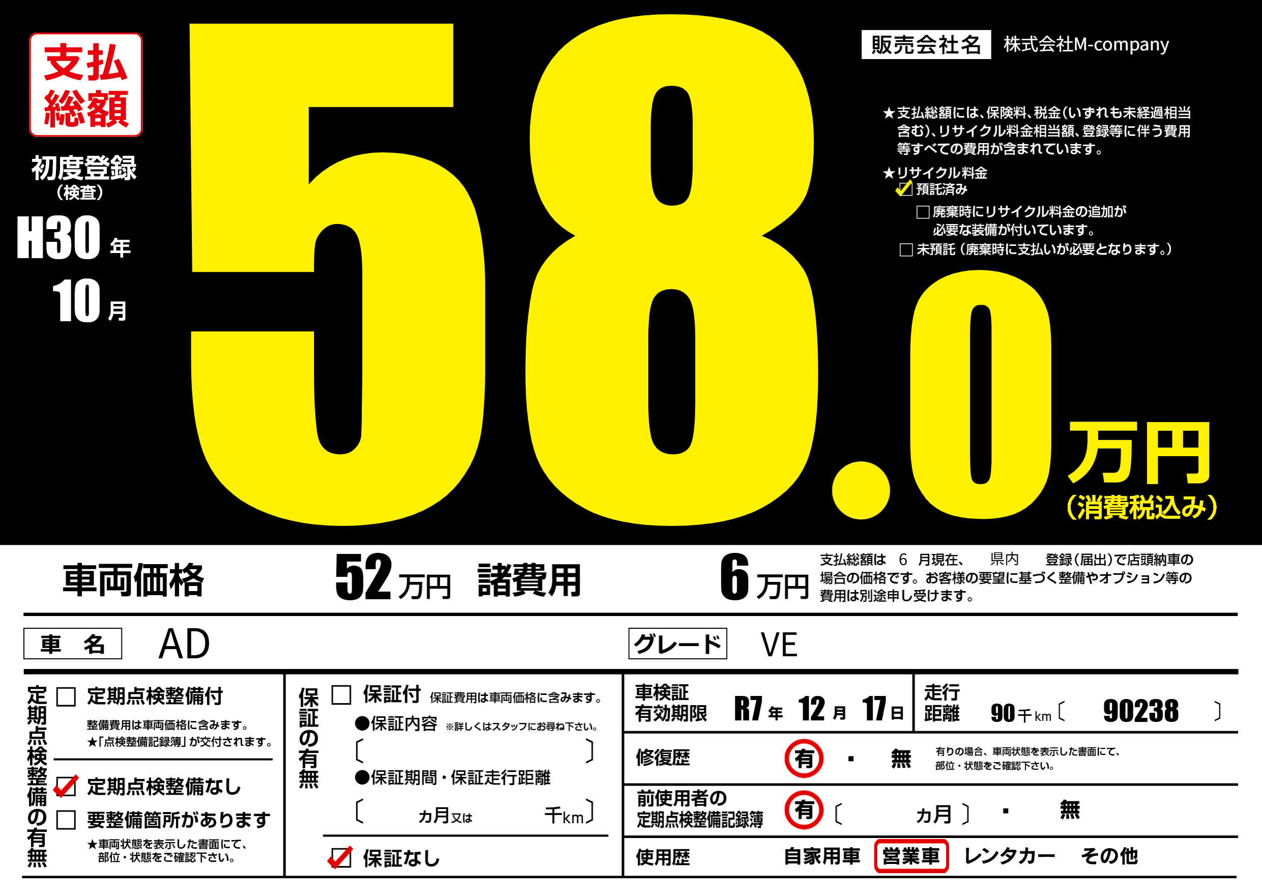 | 走行キロ | 9万km | 初年度登録 | H30年10月 |