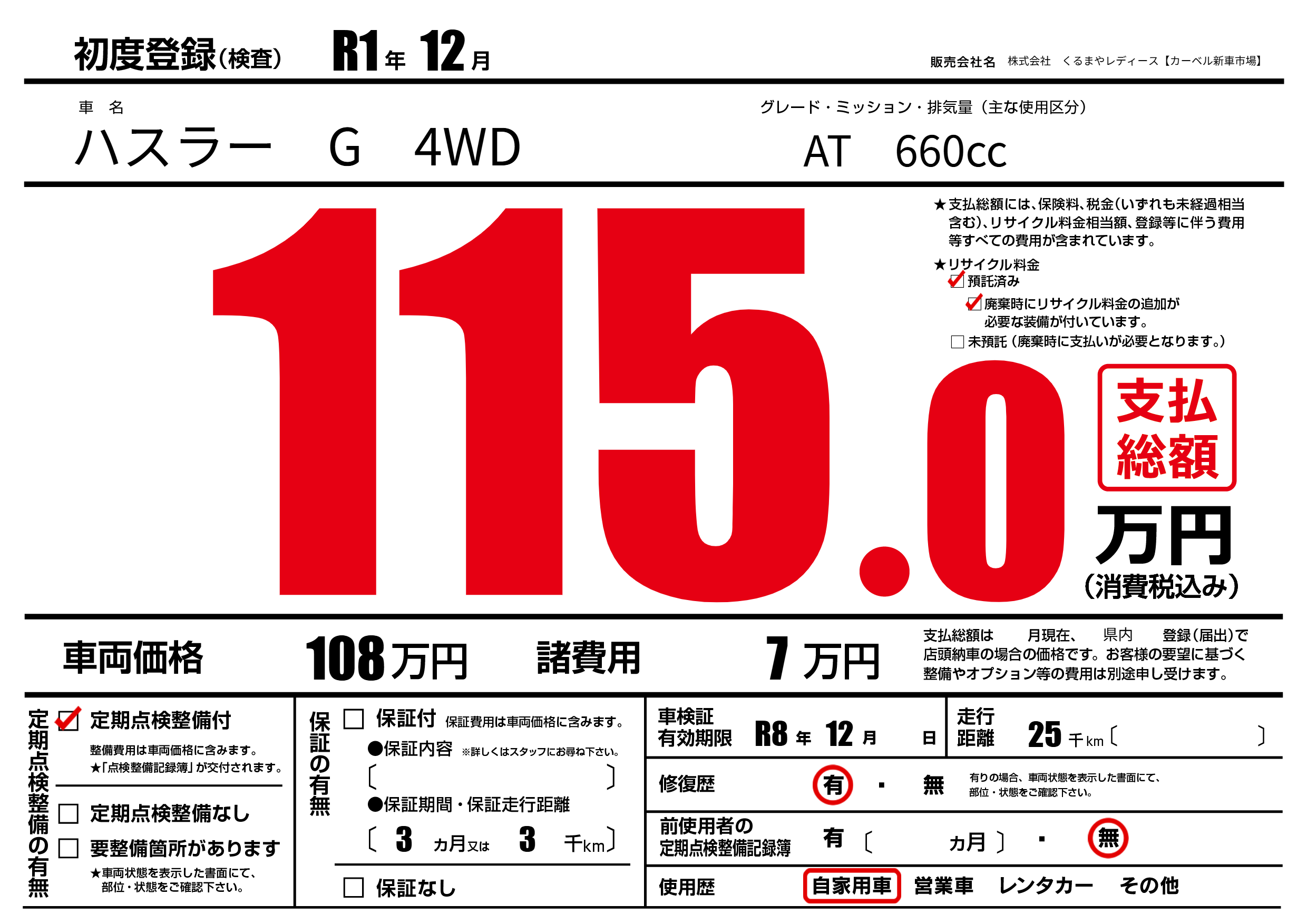 | 車名 | ハスラー G 4WD | グレード ミッション 排気量 |