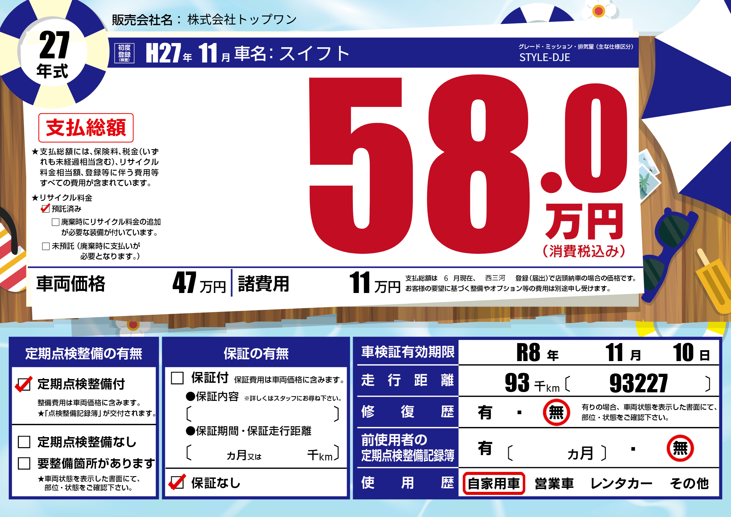 | 走行キロ | 9.3万km | 初年度登録 | H27年11月 |