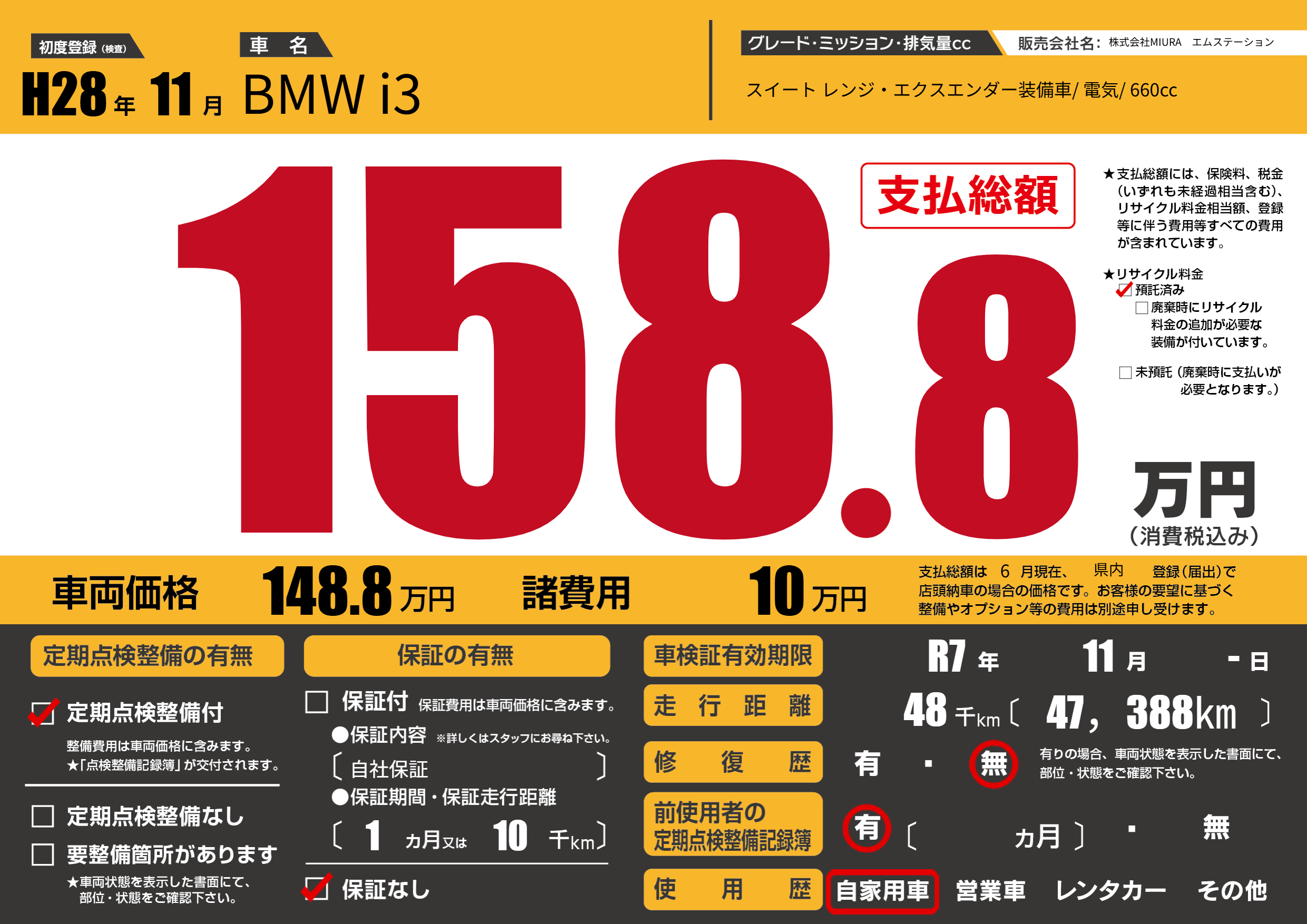| 車名 | BMW i3 | グレード ミッション 排気量 |