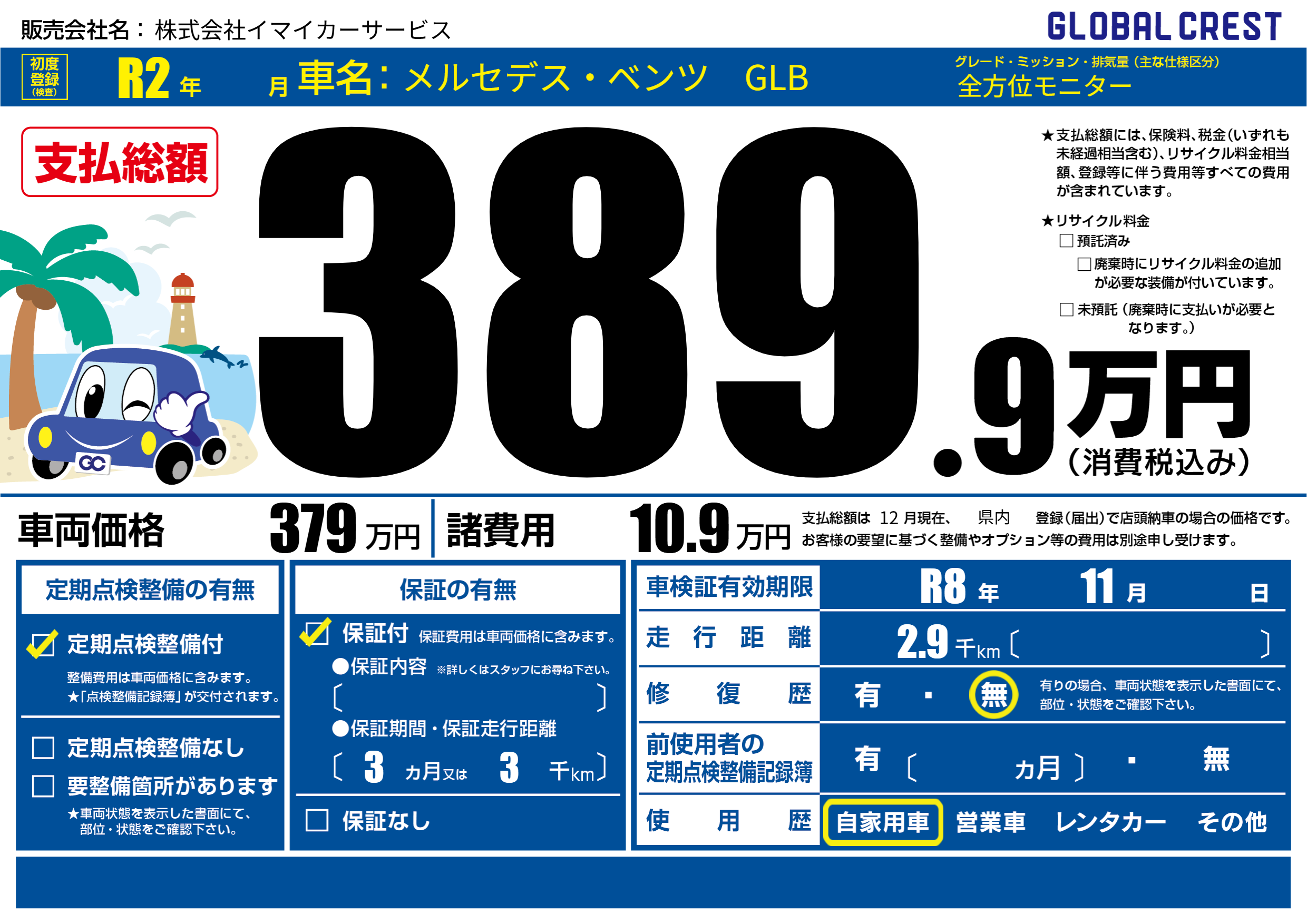 | 車名 | メルセデス・ベンツ GLB | グレード ミッション 排気量 |