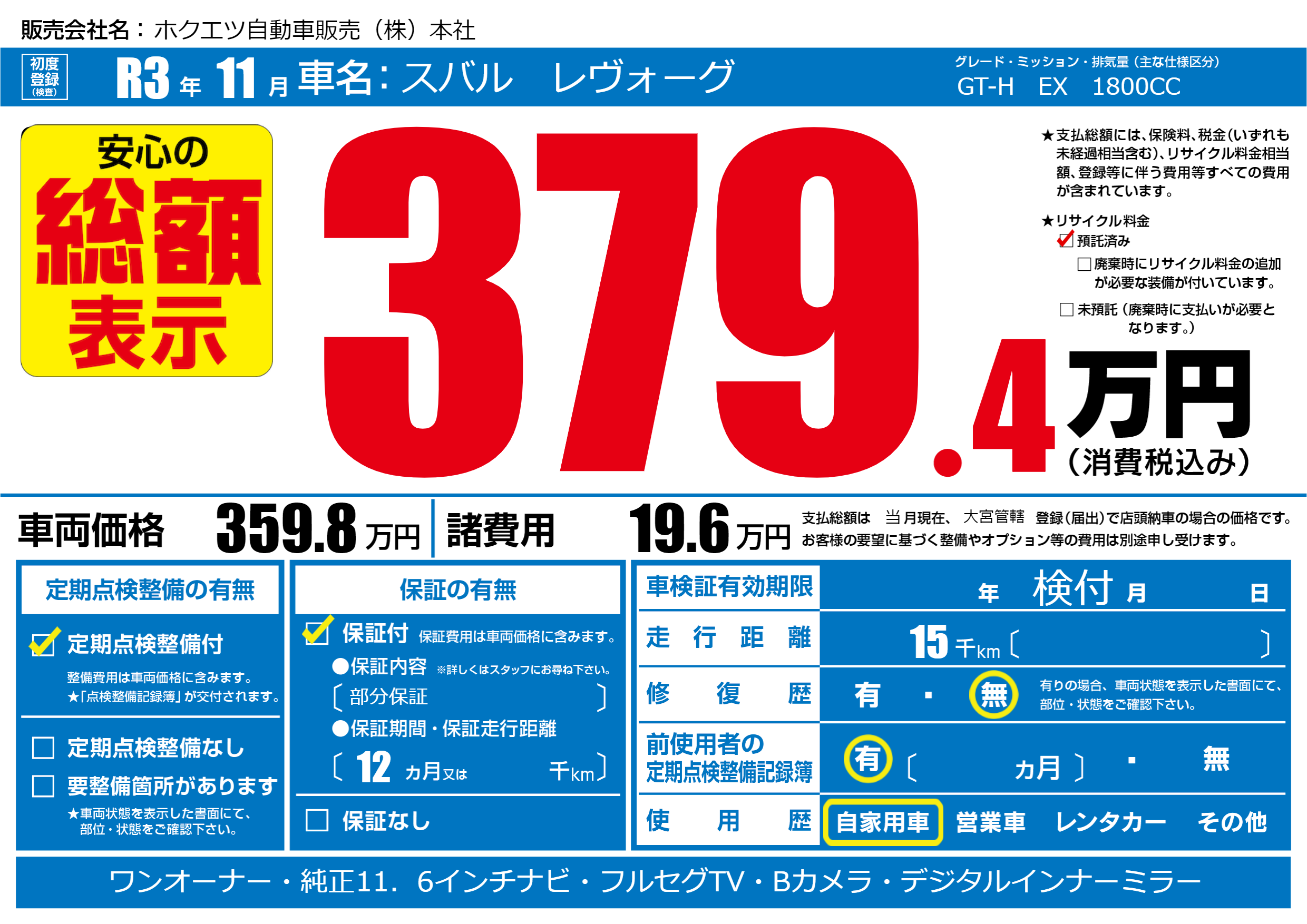 | 車名 | スバル レヴォーグ | グレード ミッション 排気量 |