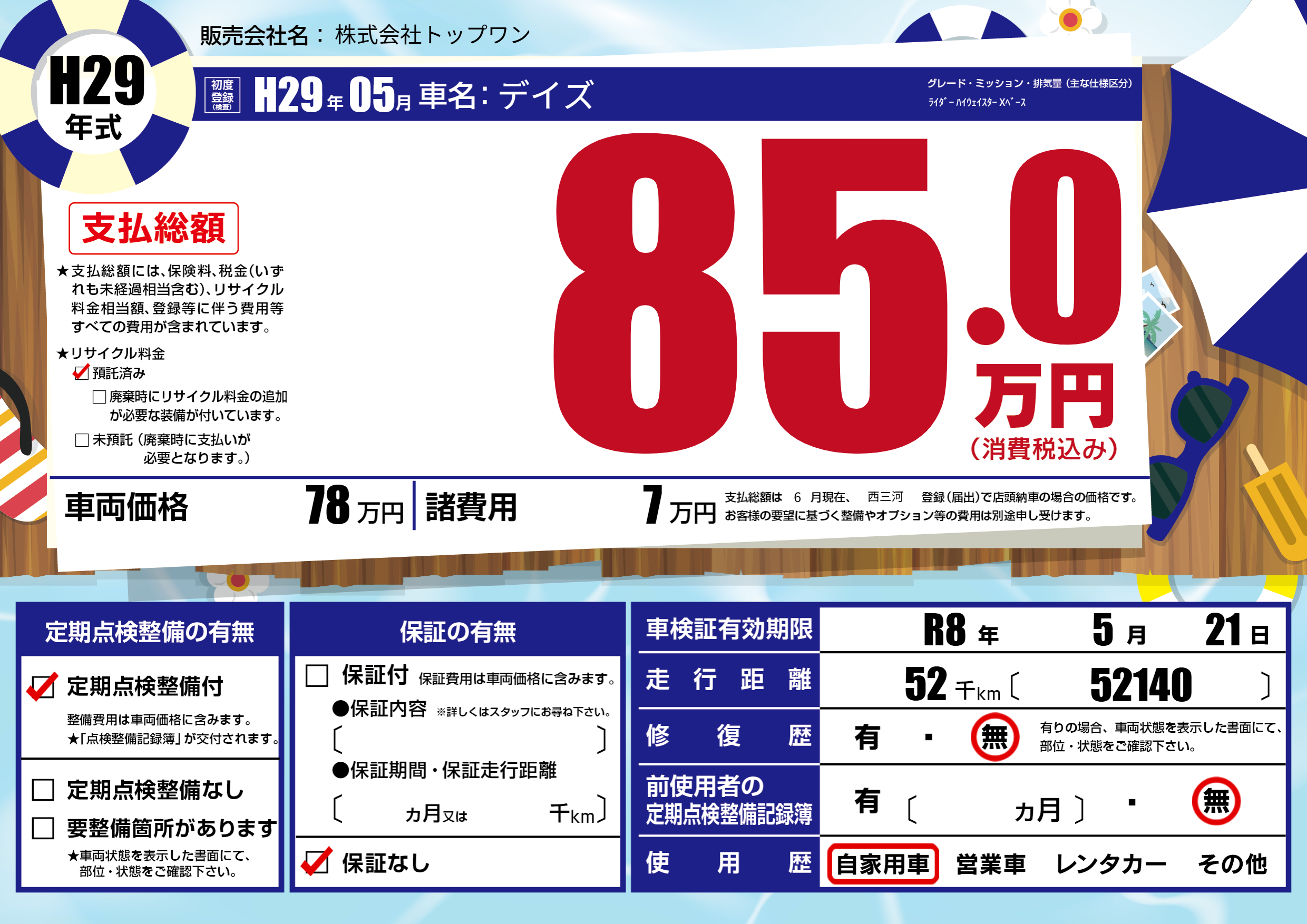 | 車名 | デイズ | グレード ミッション 排気量 |