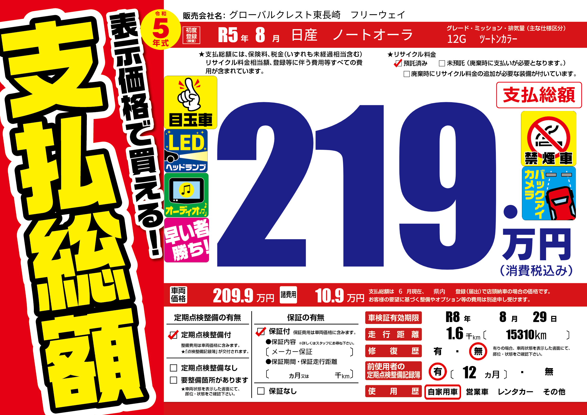 | 車名 | 日産 ノートオーラ | グレード ミッション 排気量 |