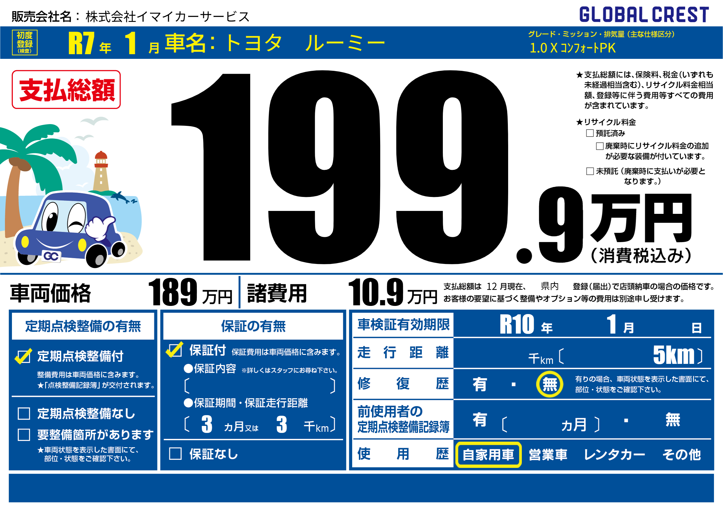 | 車名 | トヨタ ルーミー | グレード ミッション 排気量 |