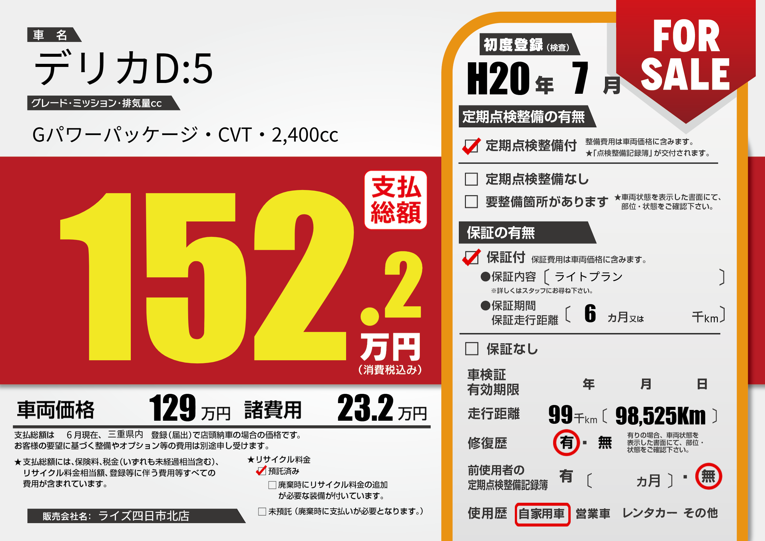 | 車名 | デリカD:5 | グレード ミッション 排気量 |