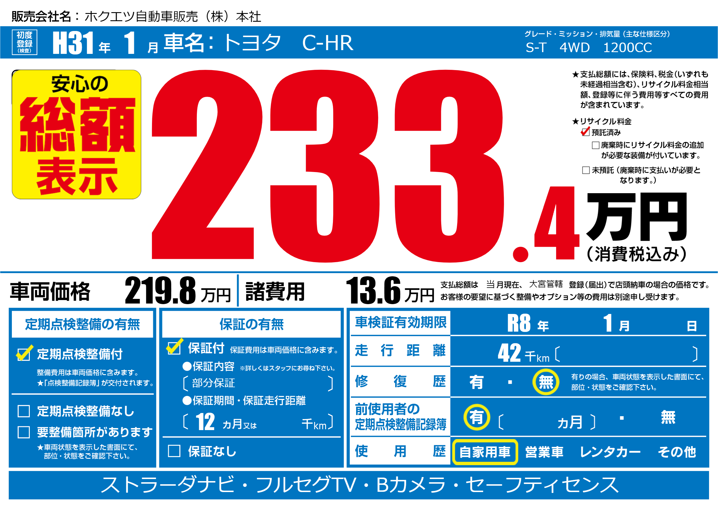 | 車検制限 | R8年 1月 - 日 | ||