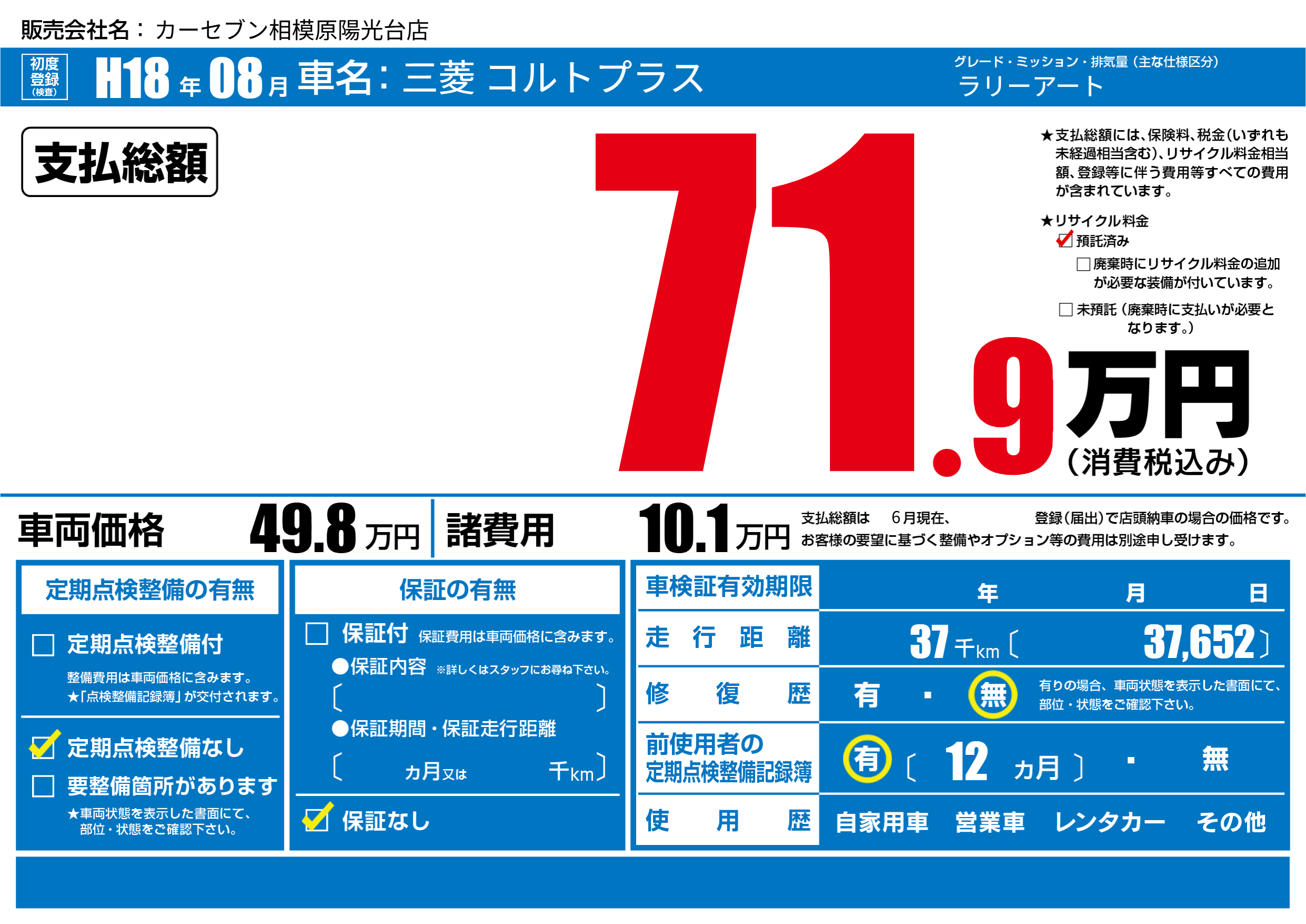 | 走行キロ | 3.7万km | 初年度登録 | H18年08月 |
