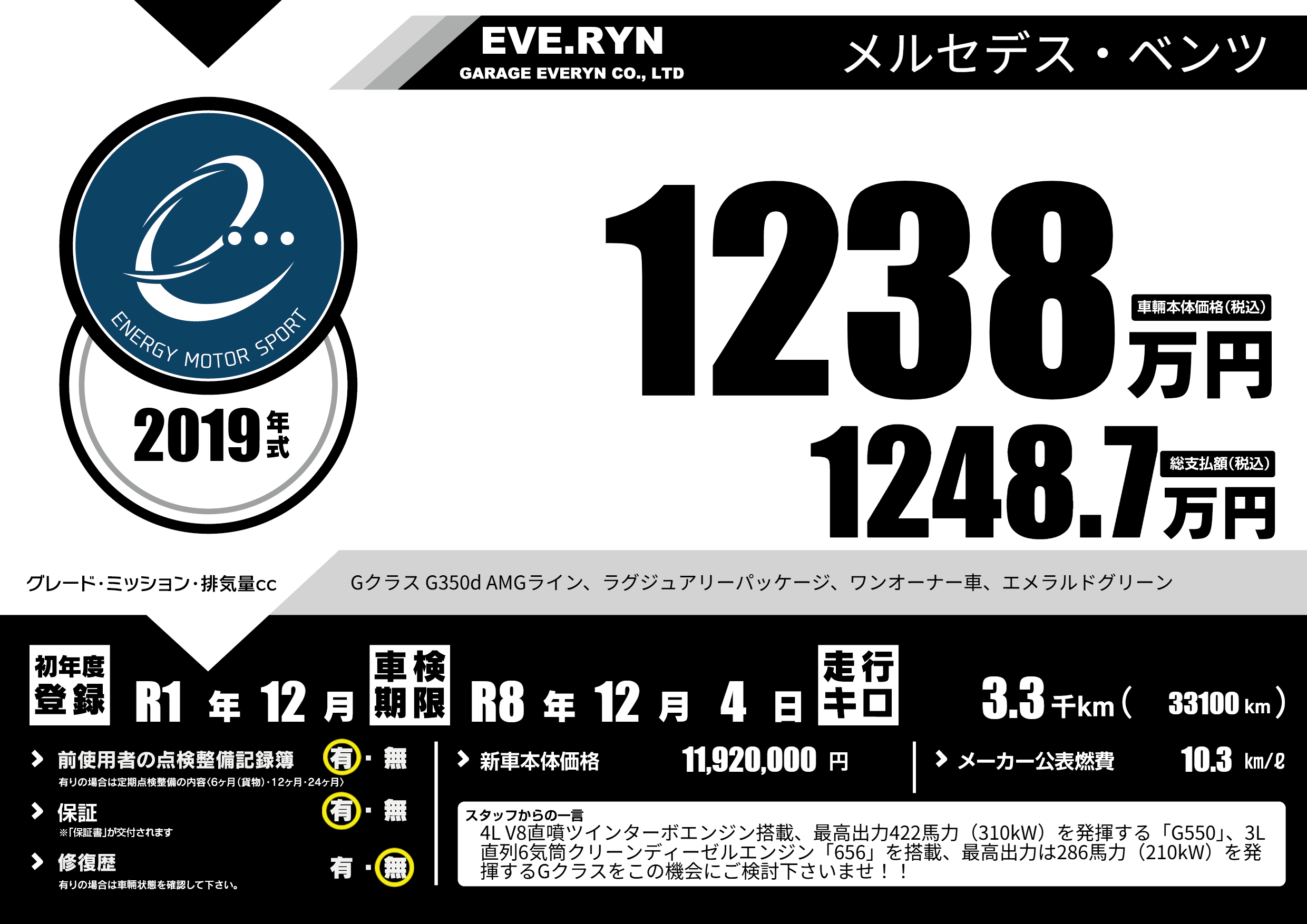 Gクラス G350d AMGライン、ラグジュアリーパッケージ、ワンオーナー車、エメラルドグリーン |