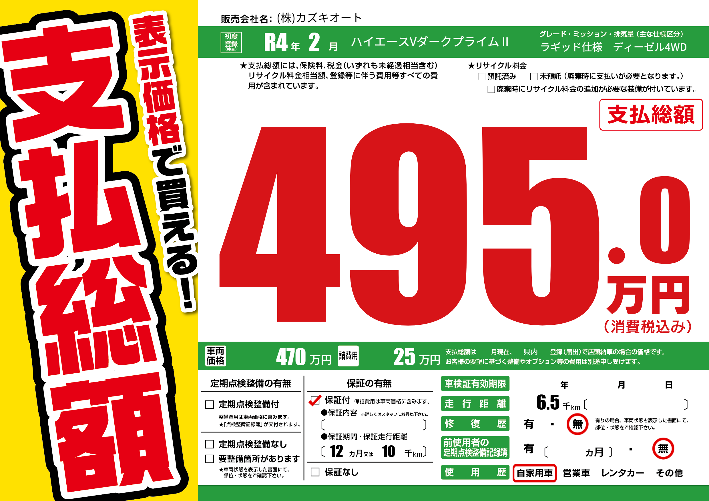 | 車名 | ハイエースVダークプライムⅡ | グレード ミッション 排気量 |