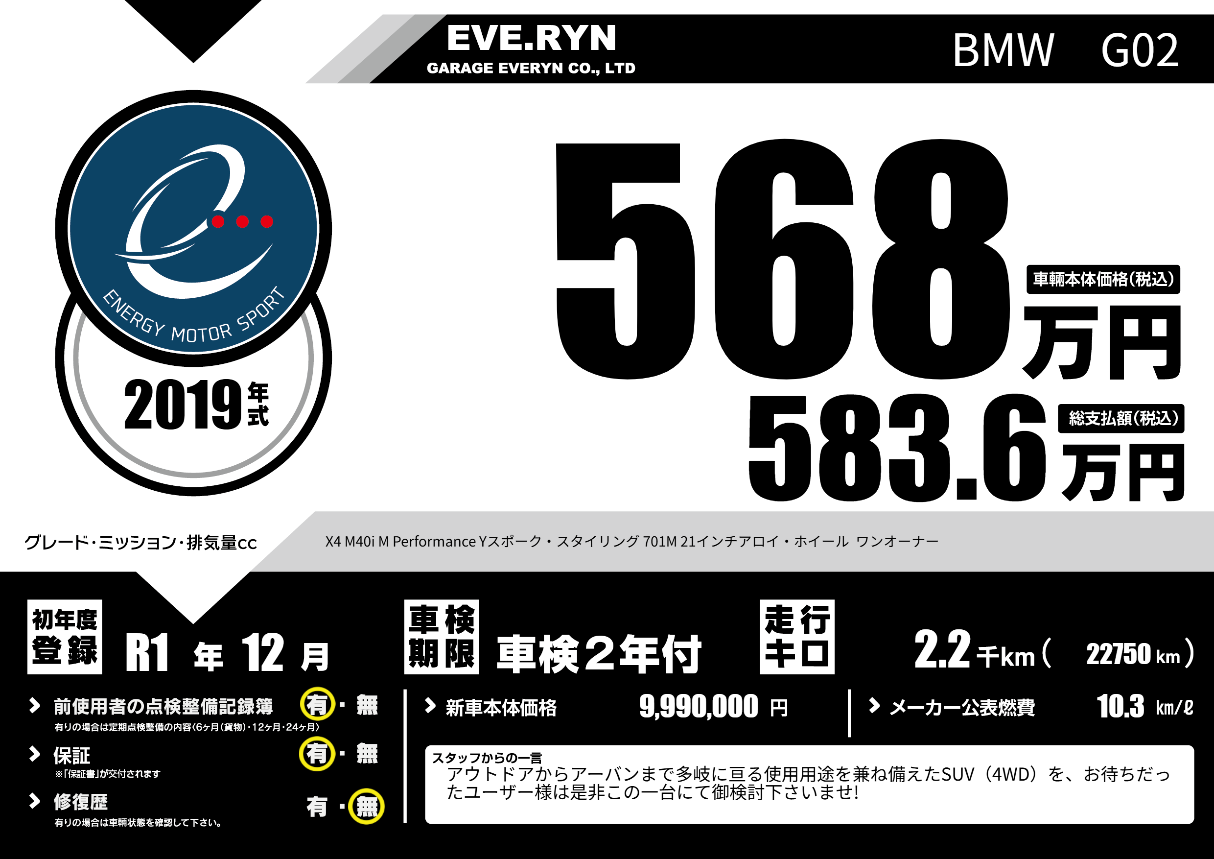 | 車名 | BMW G02 | グレード ミッション 排気量 |