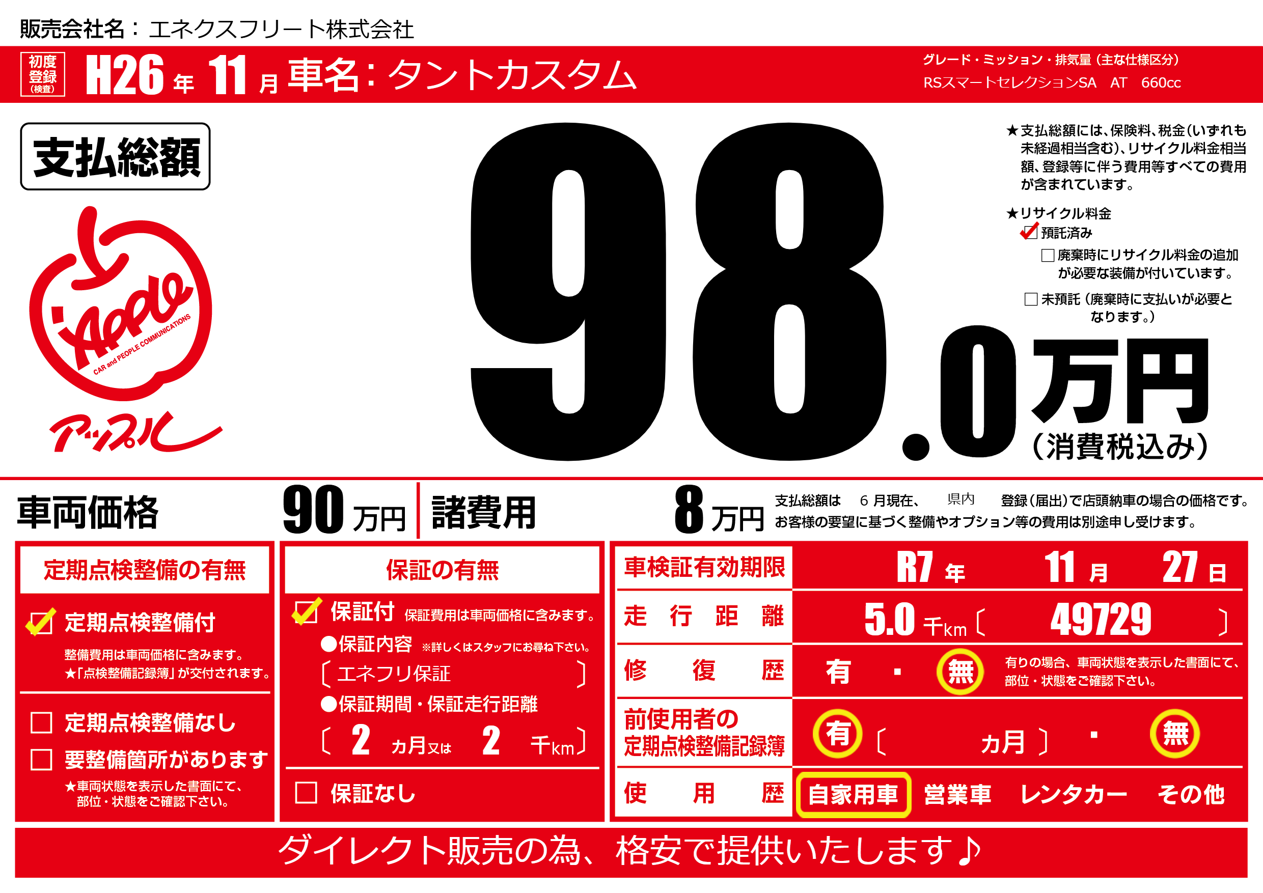 保証付き 保証内容(エネフリ保証) 2ヶ月または(2)千kmまで |