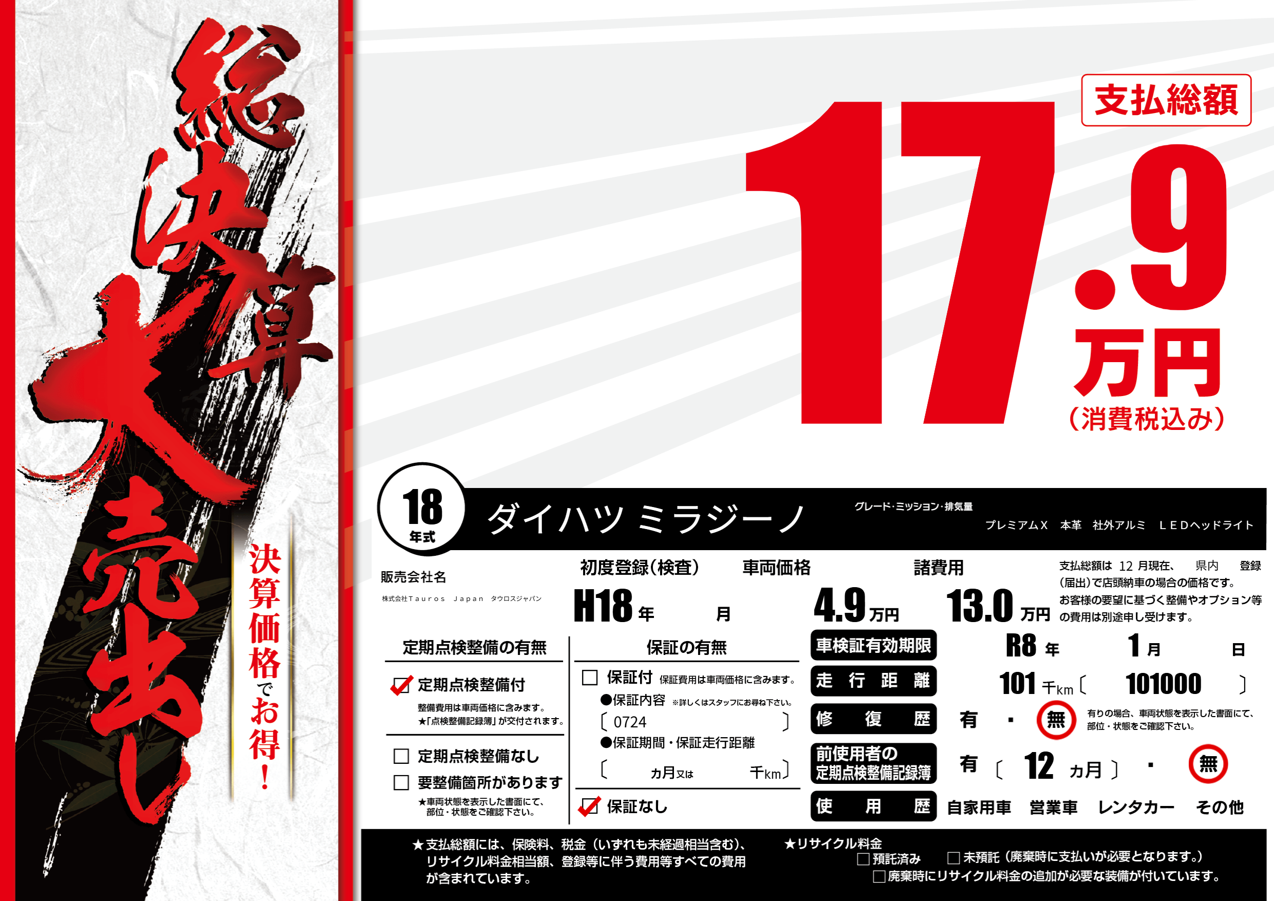 | 走行キロ | 10.1万km | 初年度登録 | H18年---月 |