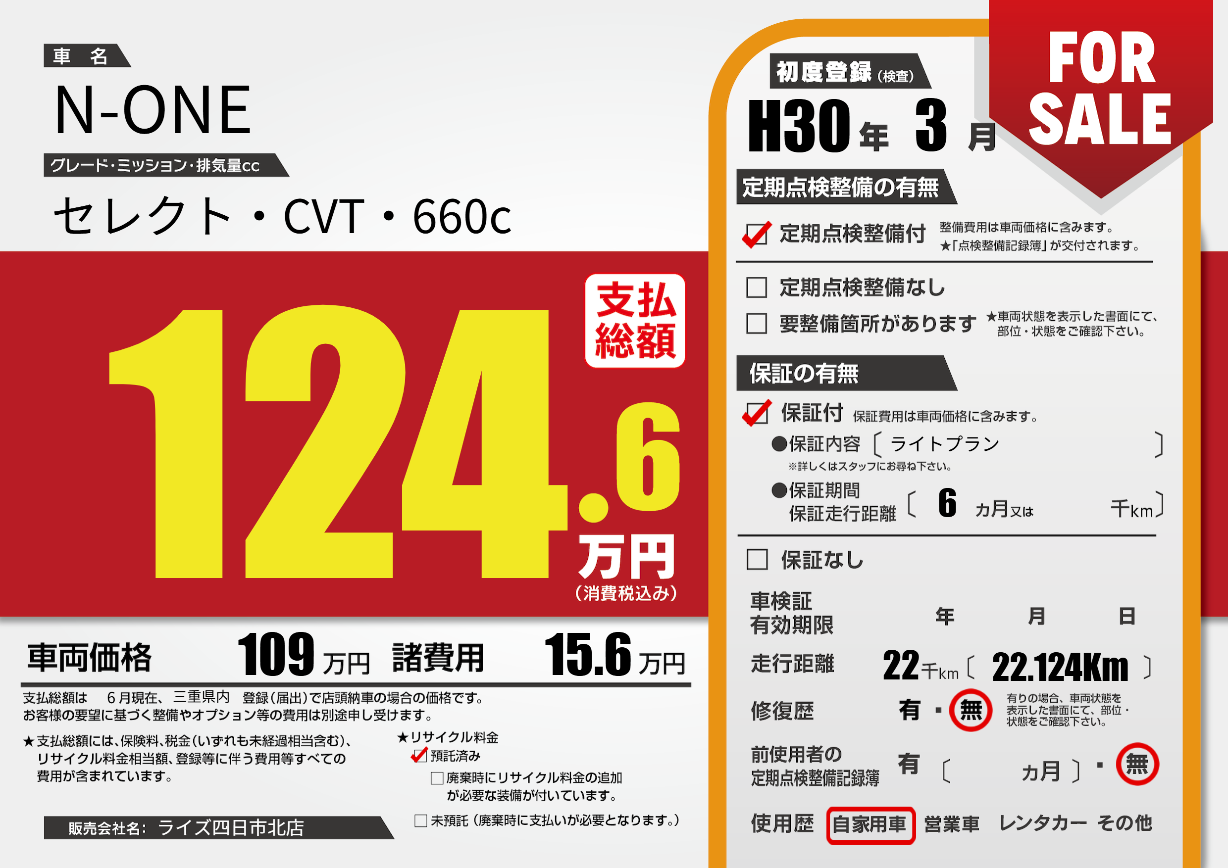 | 車名 | N-ONE | グレード ミッション 排気量 |