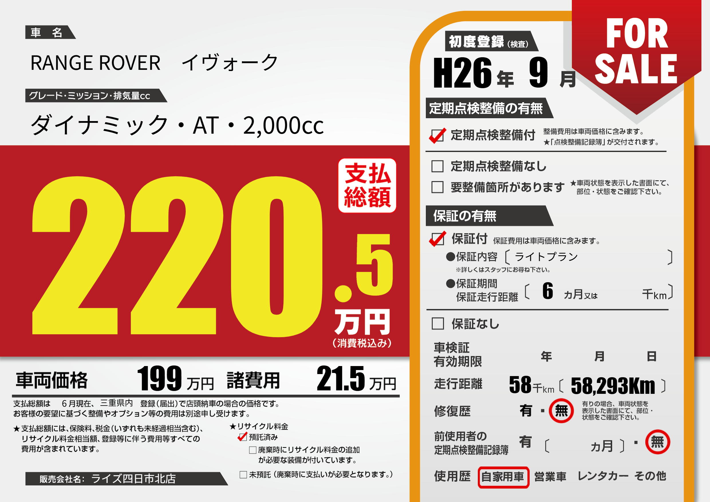 | 車名 | RANGE ROVER イヴォーク | グレード ミッション 排気量 |