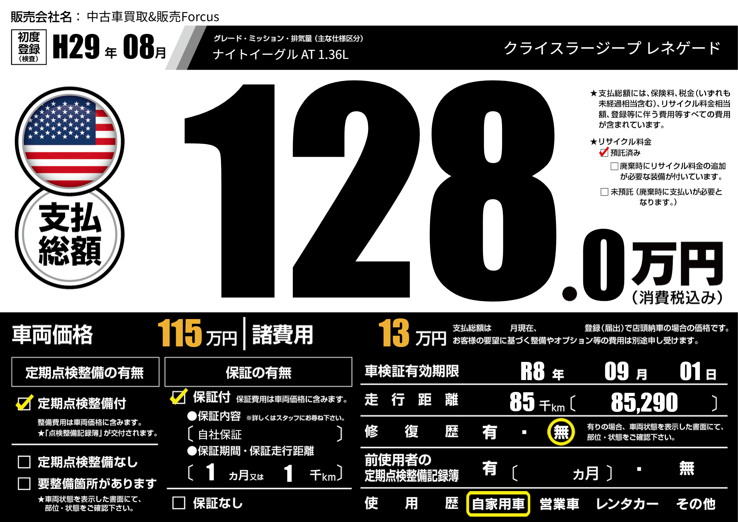 | 車名 | クライスラージープ レネゲード | グレード ミッション 排気量 |