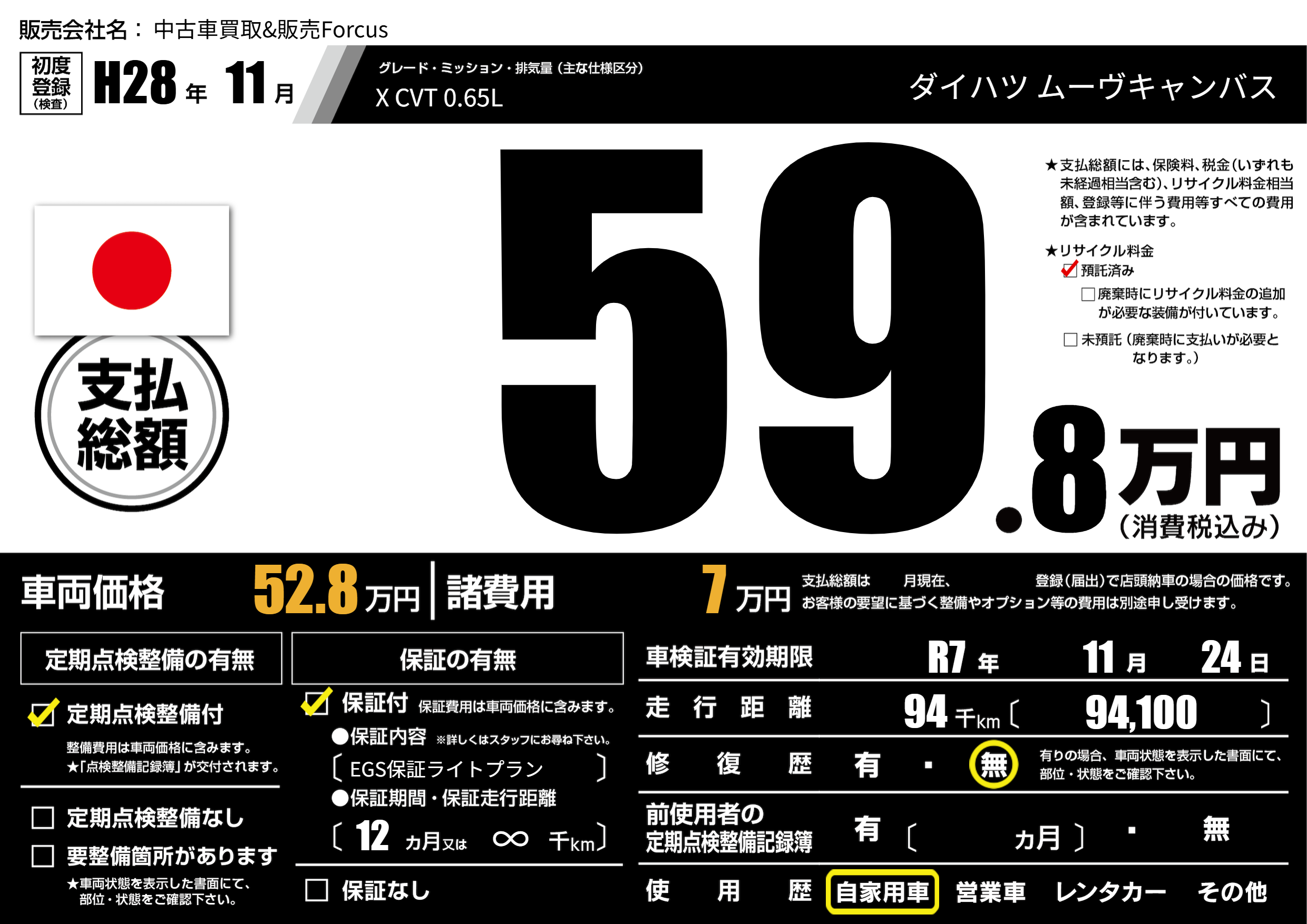 | 走行キロ | 9.4万km | 初年度登録 | H28年11月 |