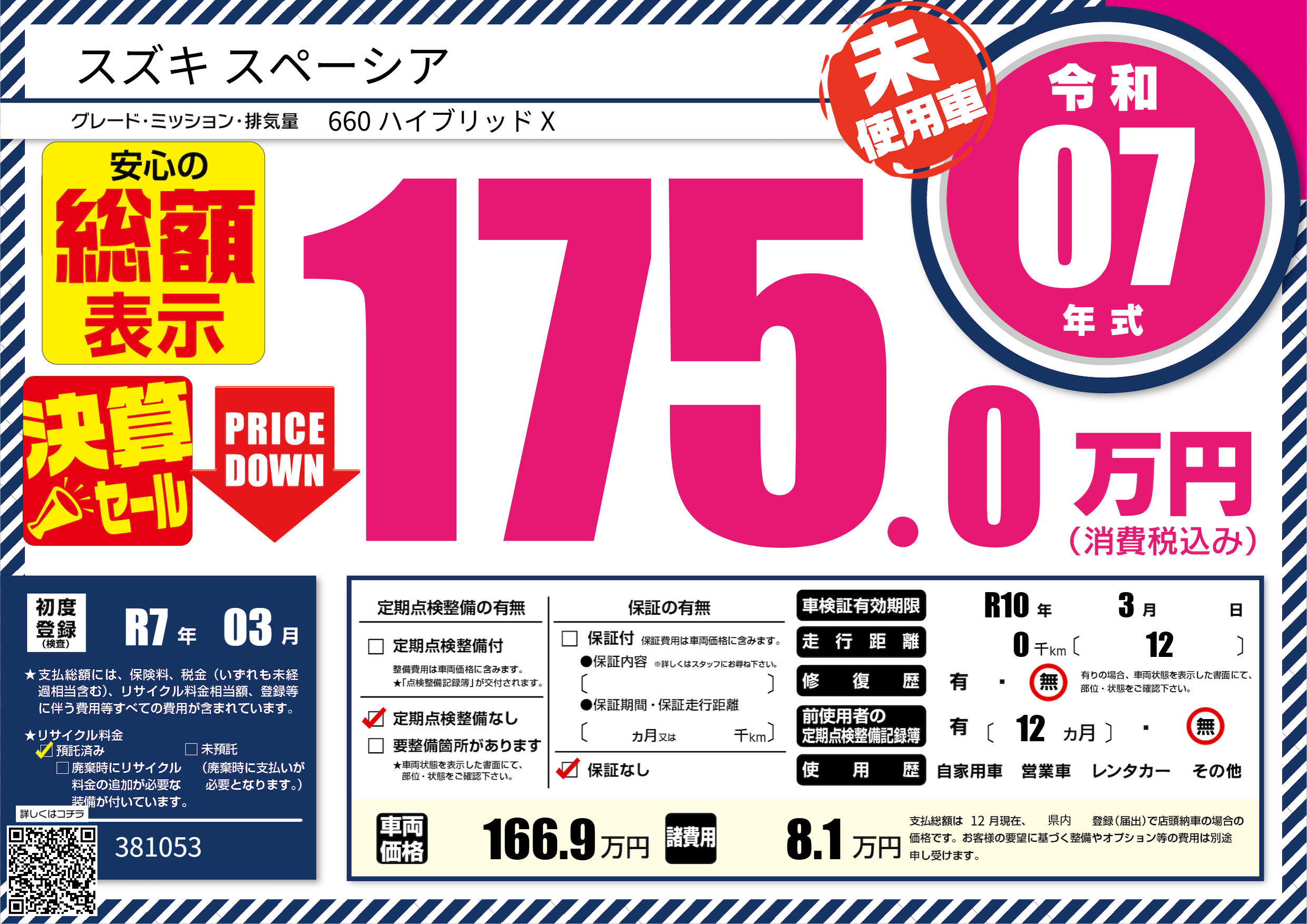 | 走行キロ | - | 初年度登録 | R7年03月 |