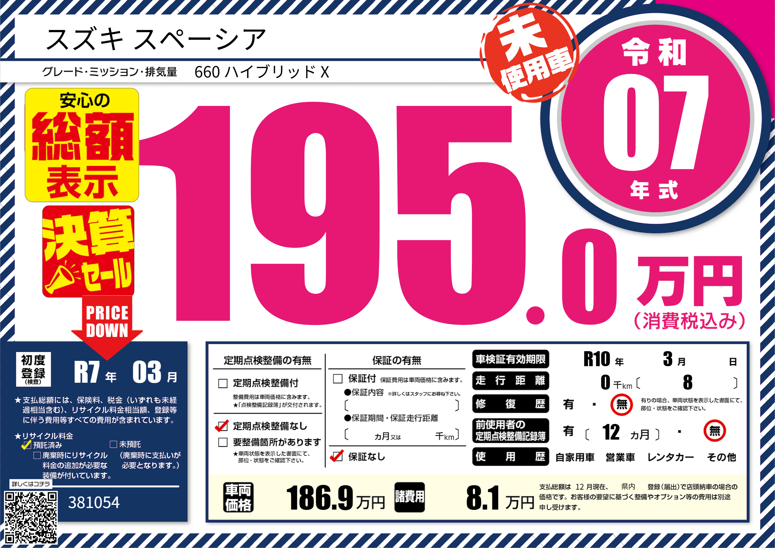| 走行キロ | - | 初年度登録 | R7年03月 |