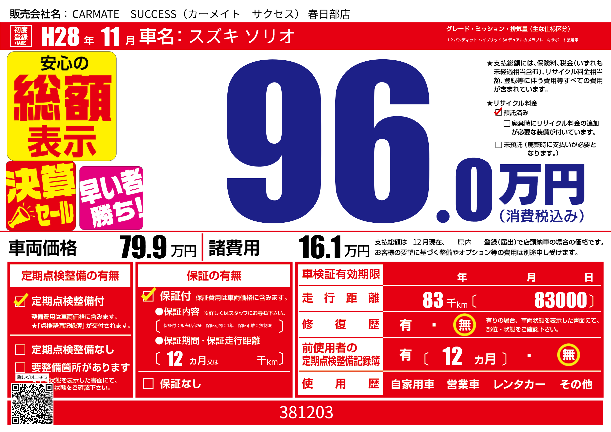 保証なし 保証内容(保証付:販売店保証 保証期間:1年 保証距離:無制限) 12ヶ月または()千kmまで |