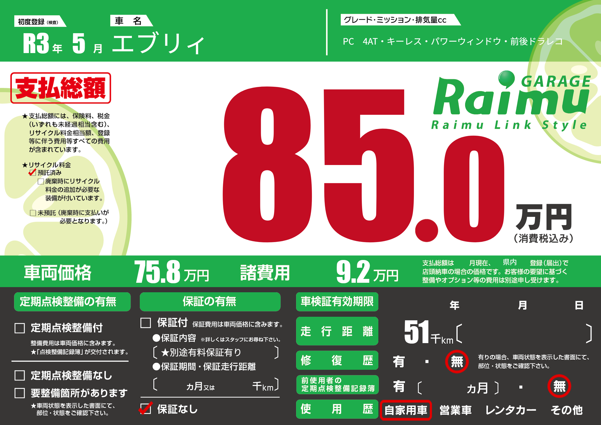 | 車名 | エブリィ | グレード ミッション 排気量 |