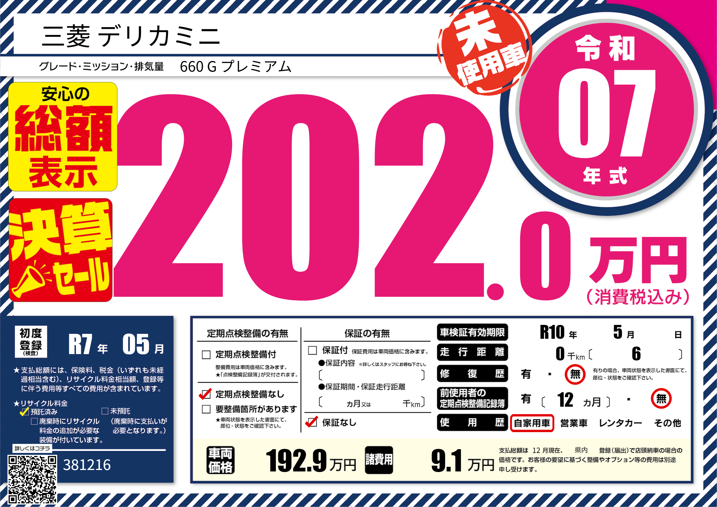 | 走行キロ | - | 初年度登録 | R7年05月 |