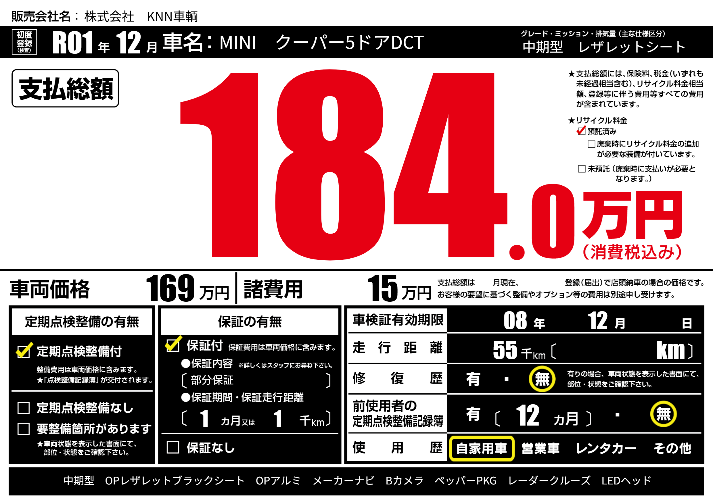 | 車名 | MINI クーパー5ドアDCT | グレード ミッション 排気量 |