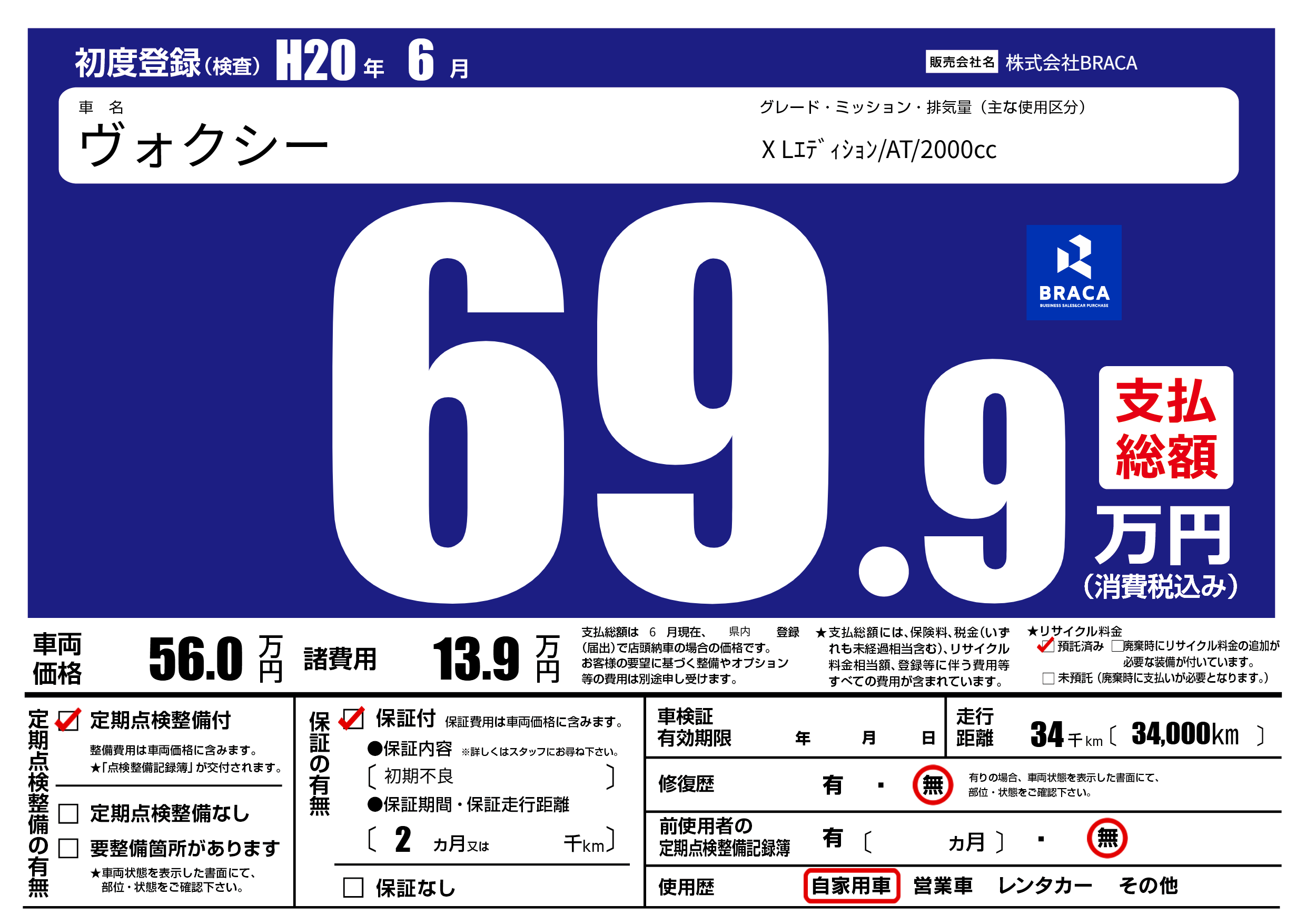 | 走行キロ | 3.4万km | 初年度登録 | H20年6月 |