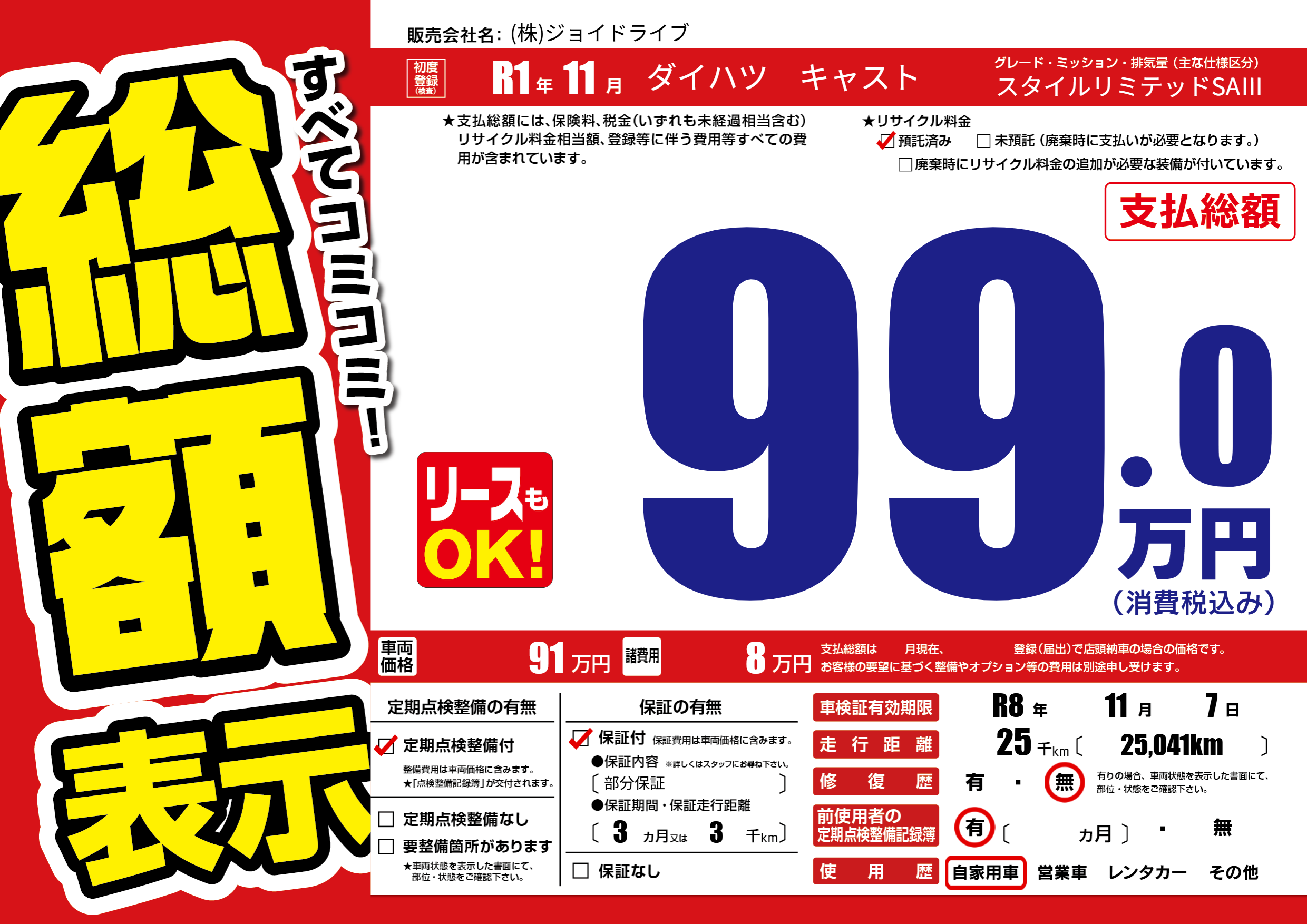 | 車名 | ダイハツ キャスト | グレード ミッション 排気量 |