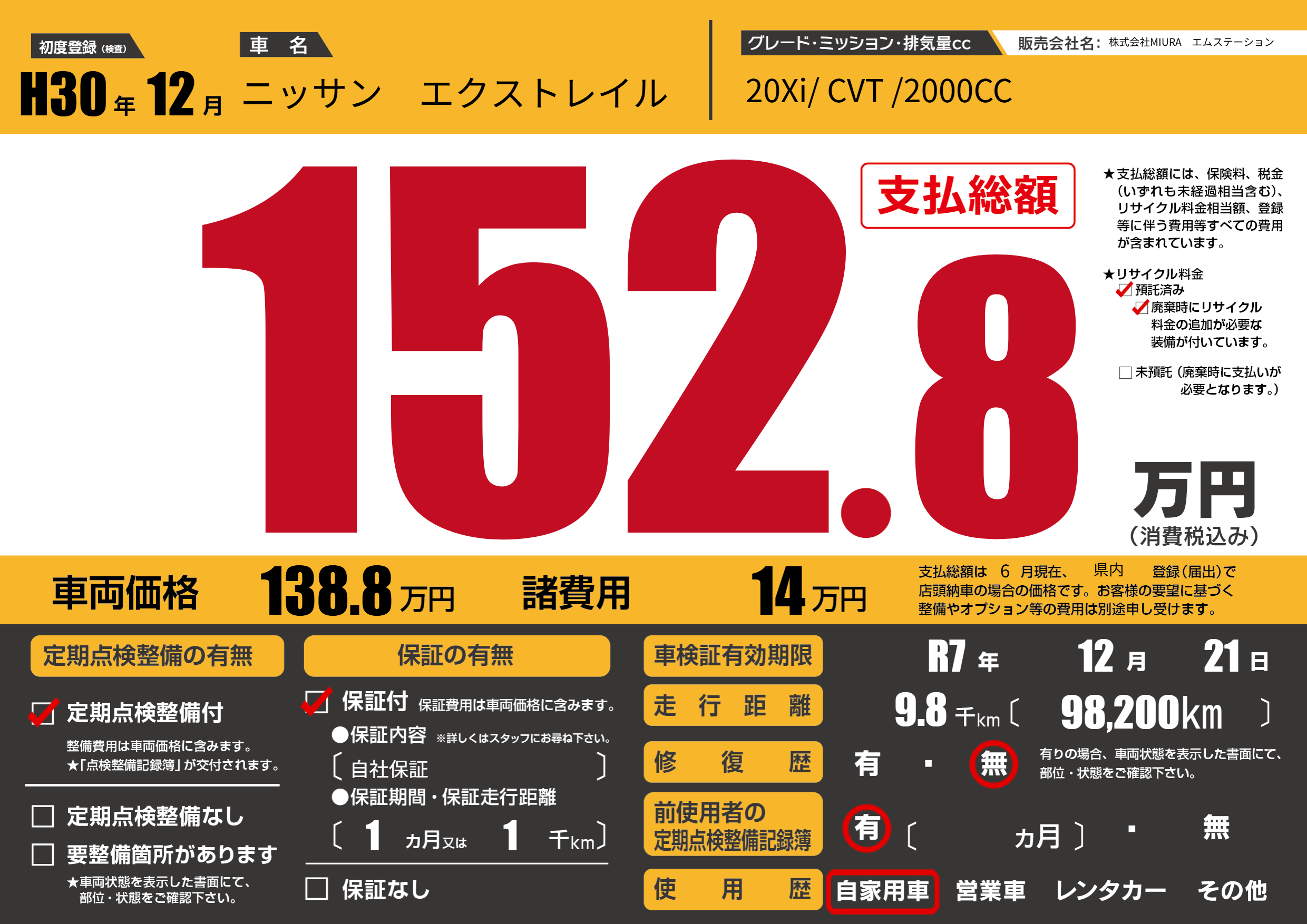 | 車名 | ニッサン エクストレイル | グレード ミッション 排気量 |