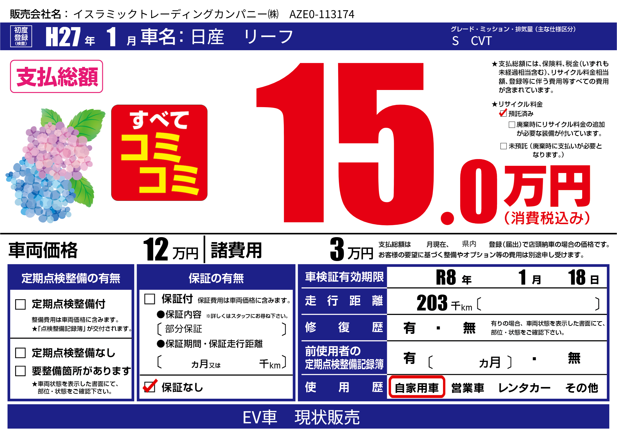 | 車名 | 日産 リーフ | グレード ミッション 排気量 |