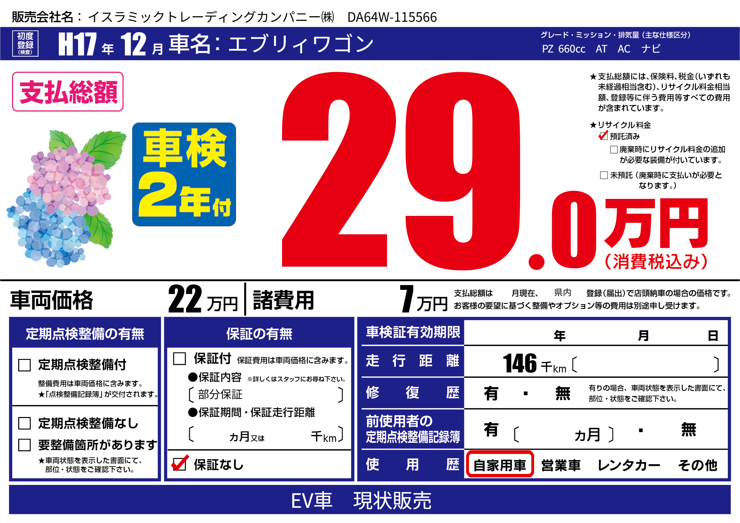 | 走行キロ | 14.6万km | 初年度登録 | H17年12月 |