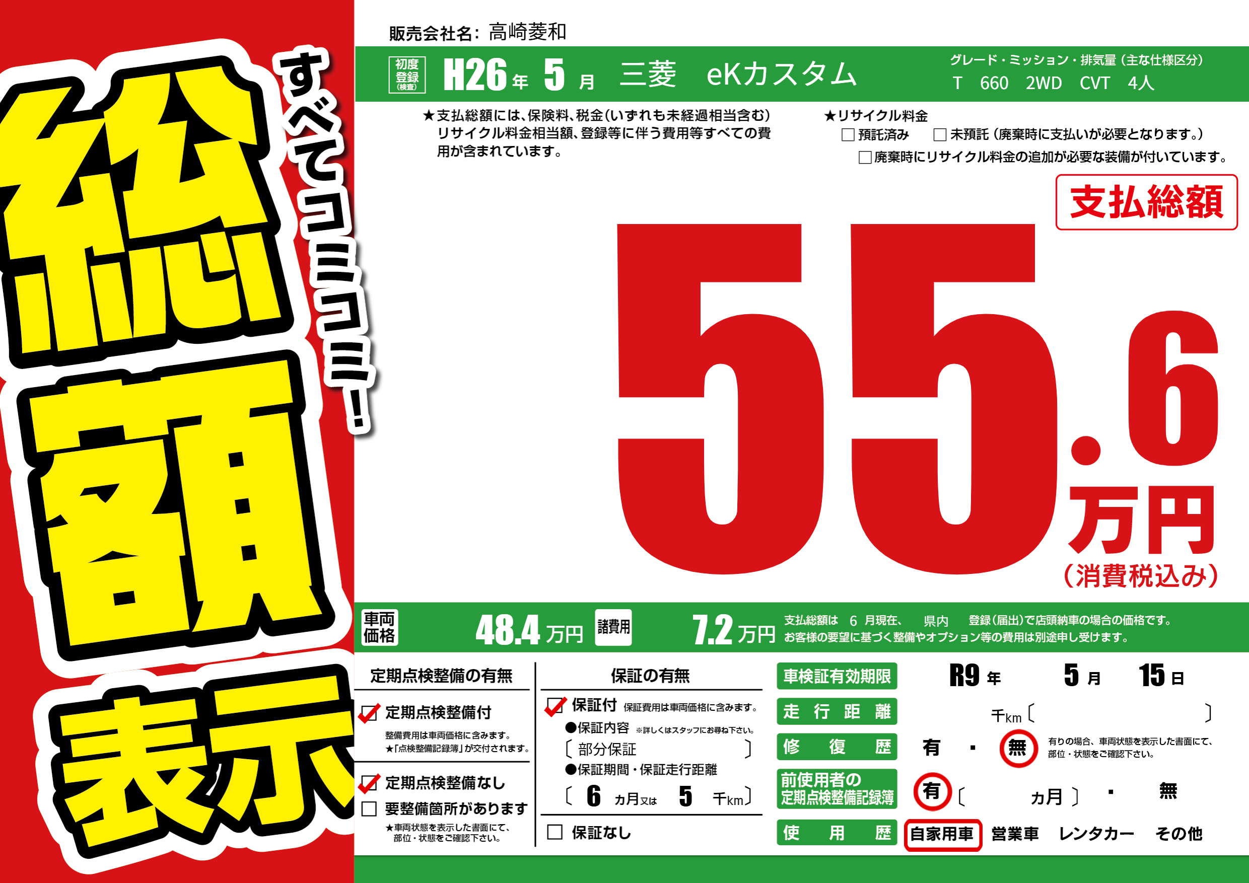 | 車名 | 三菱 eKカスタム | グレード ミッション 排気量 |