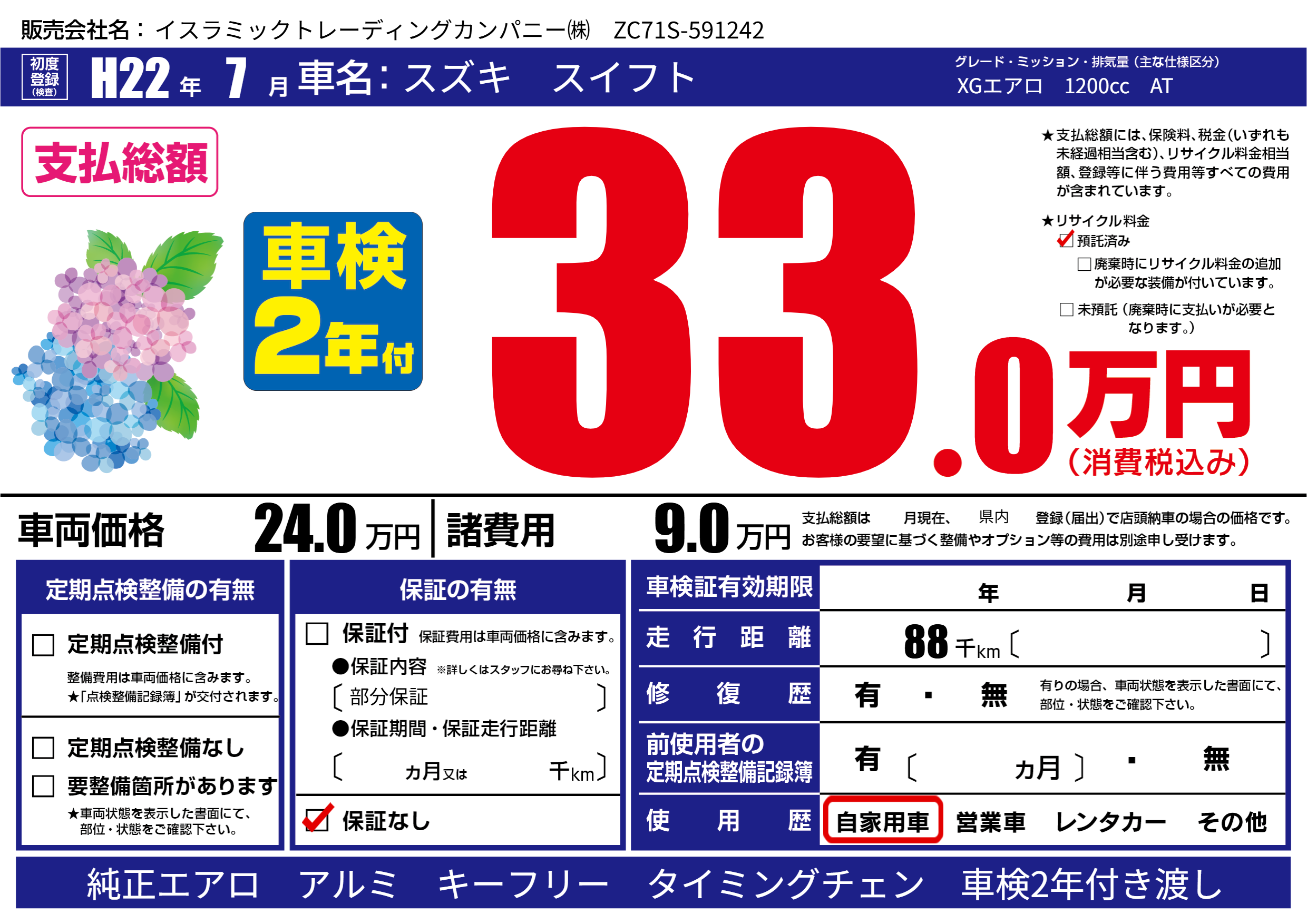 | 走行キロ | 8.8万km | 初年度登録 | H22年7月 |