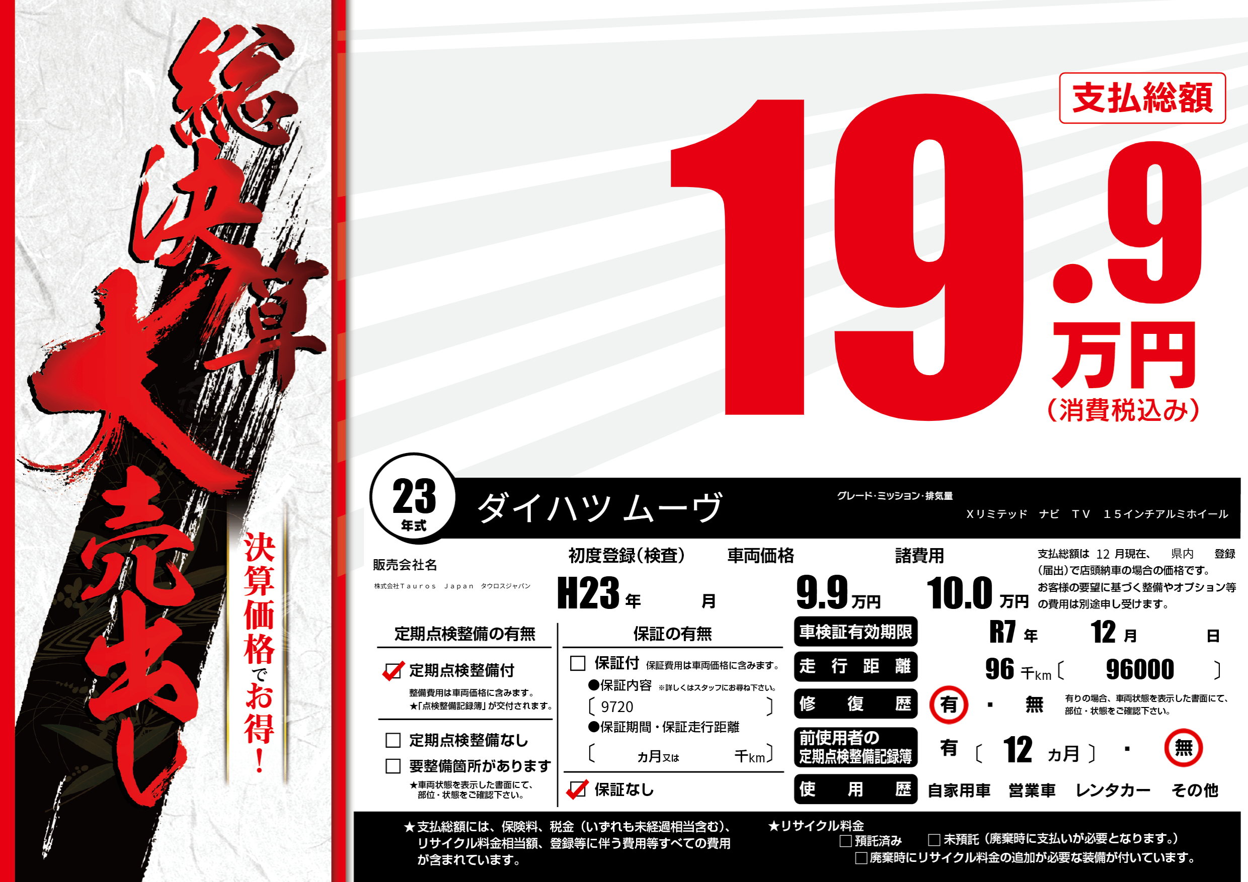 なし | 車検制限 | R7年12月---月 |