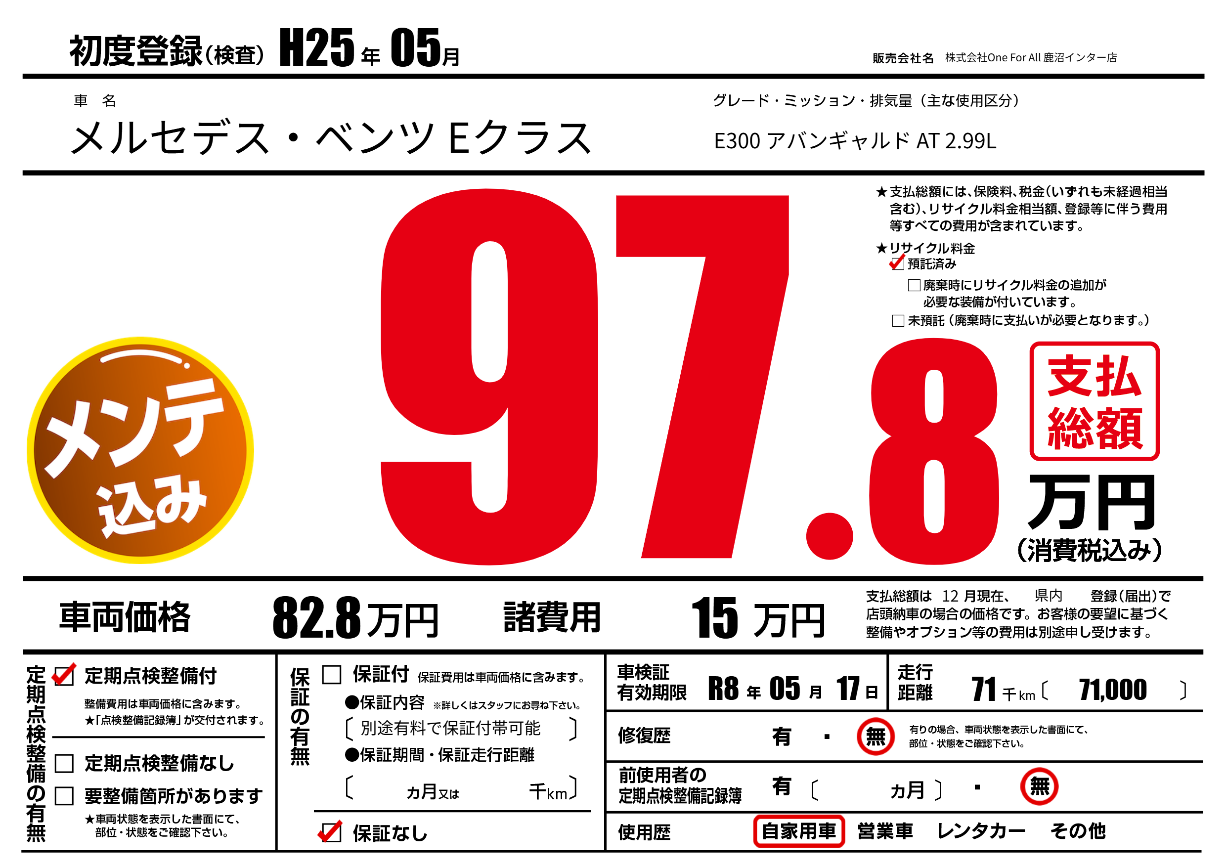 | 車名 | メルセデス・ベンツ Eクラス | グレード ミッション 排気量 |
