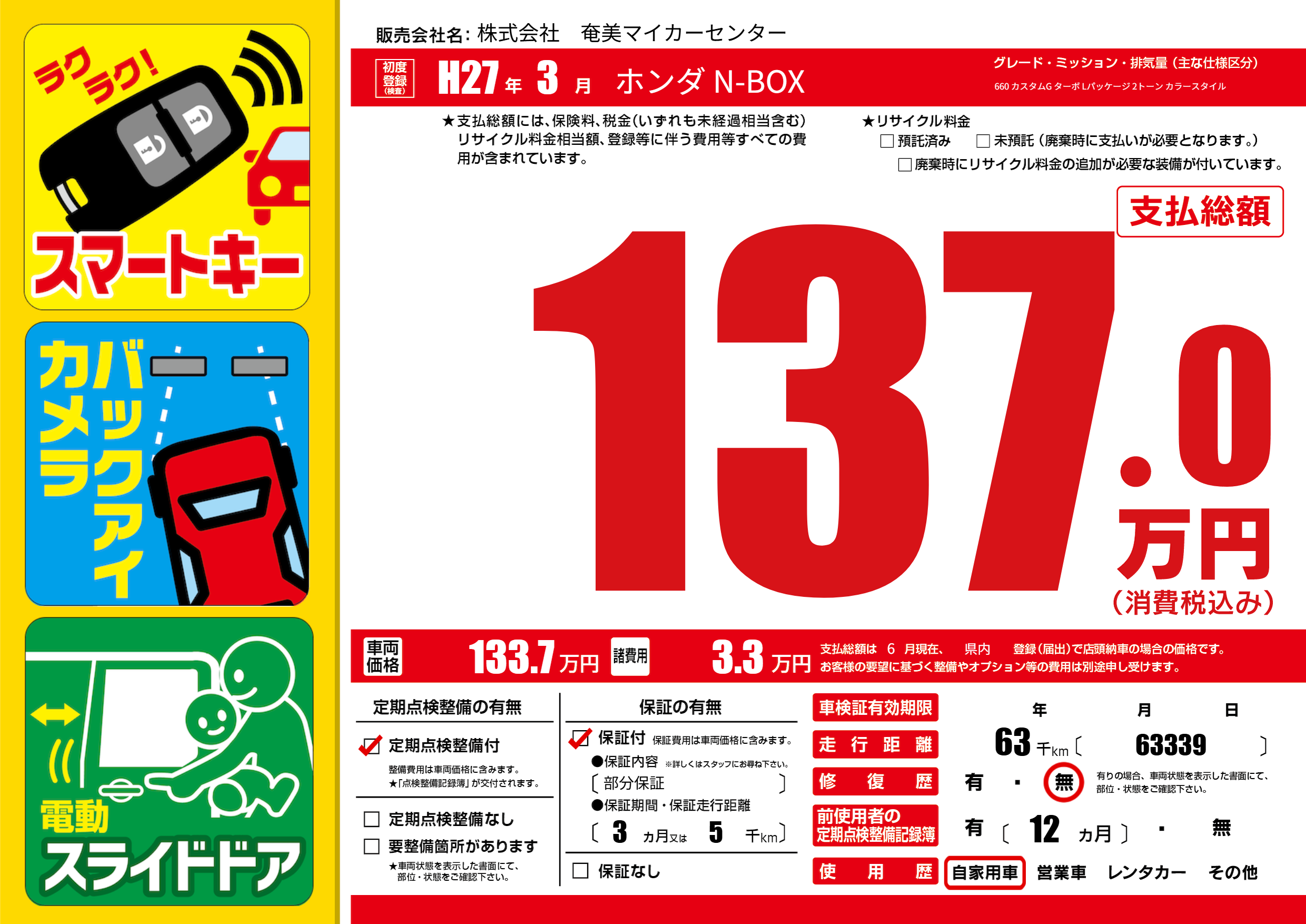 | 走行キロ | 6.3万km | 初年度登録 | H27年3月 |