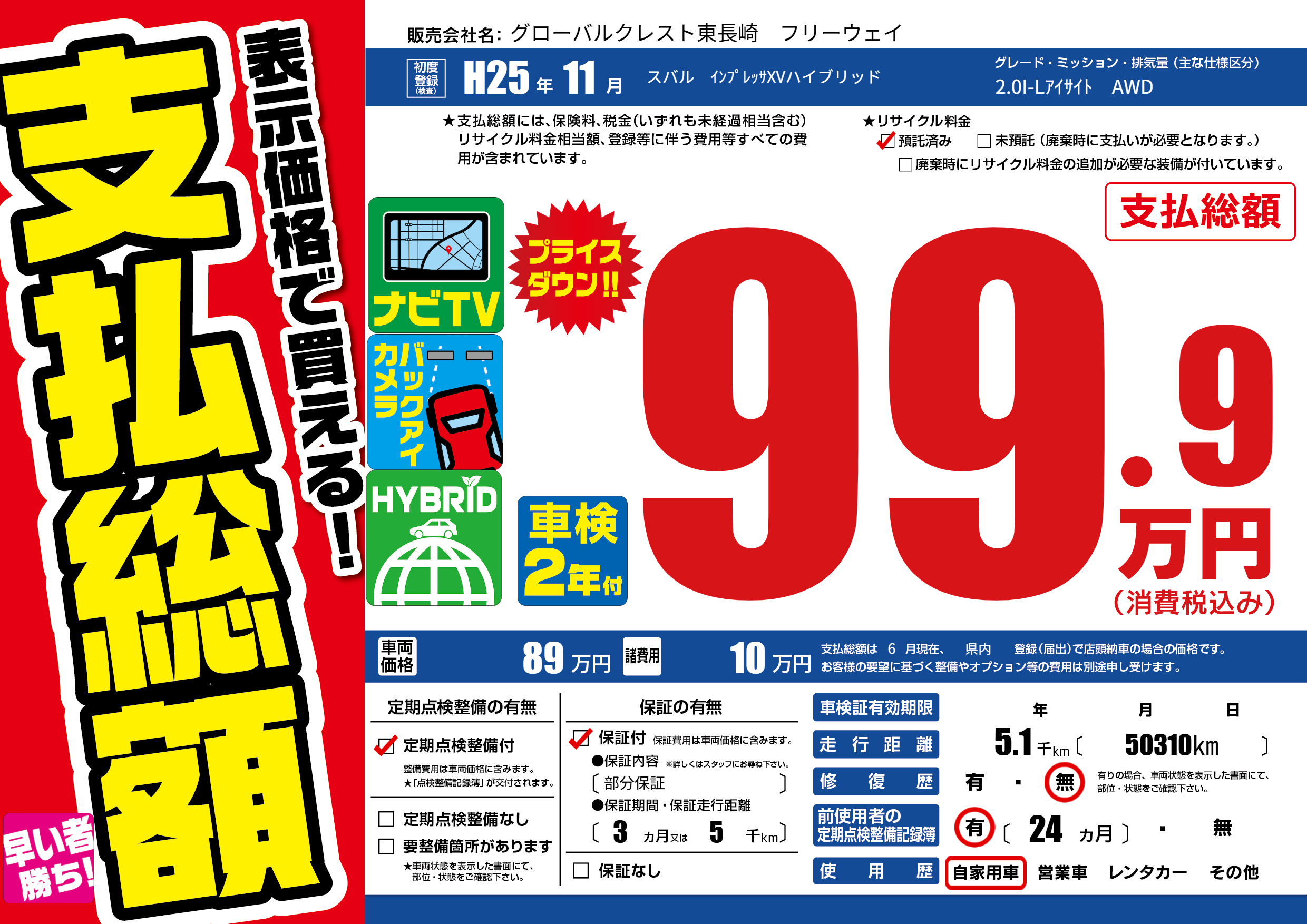 | 走行キロ | 0.5万km | 初年度登録 | H25年11月 |