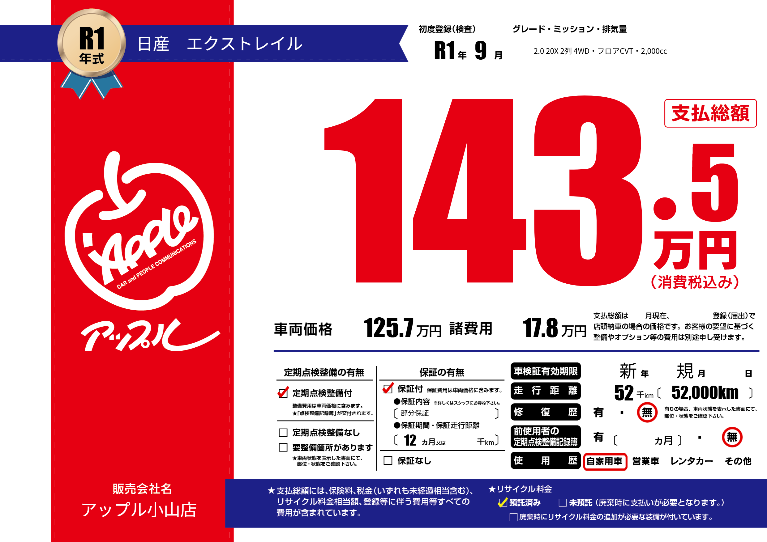 | 走行キロ | 5.2万km | 初年度登録 | R1年9月 |