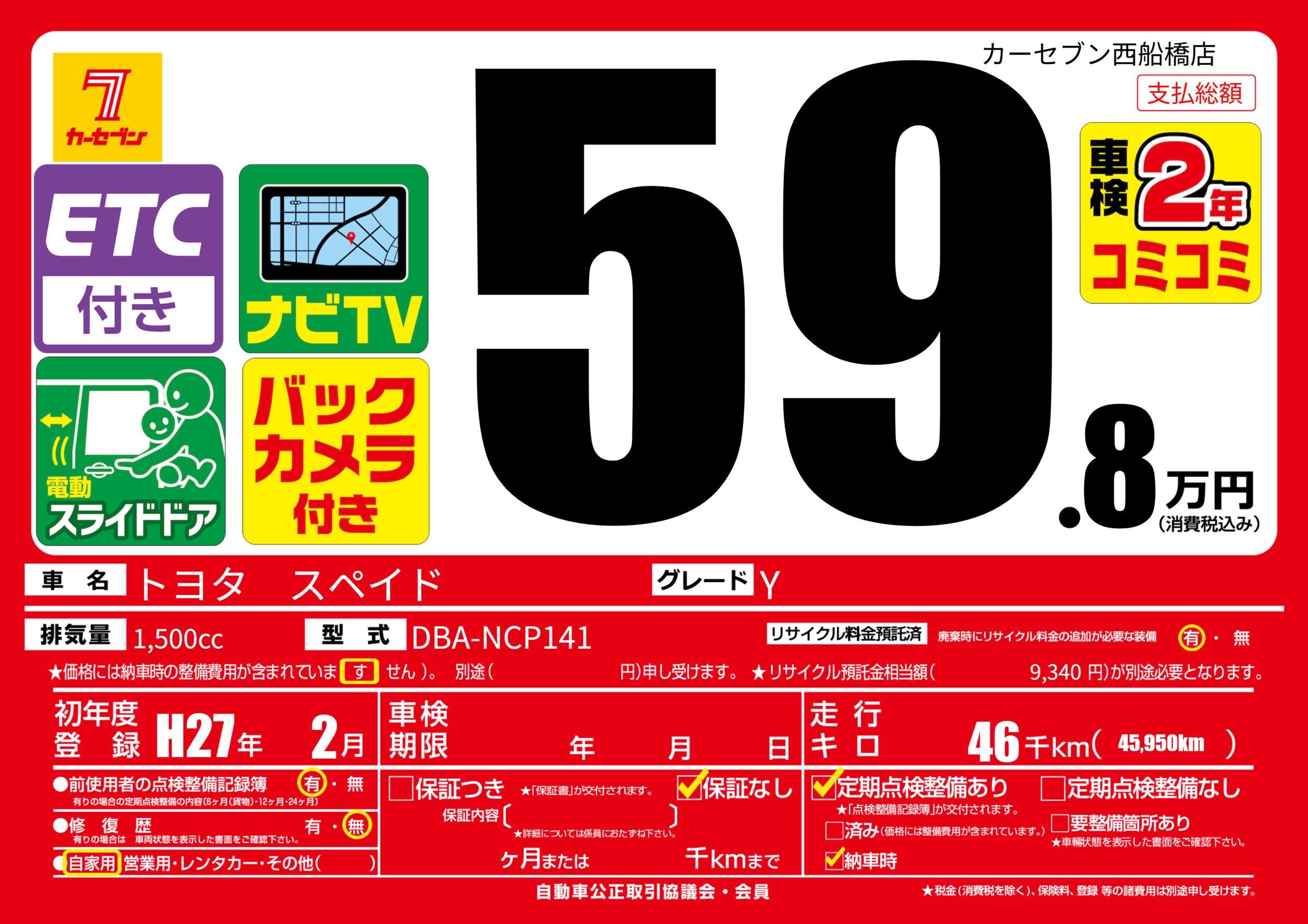 | 車名 | トヨタ スペイド | グレード ミッション 排気量 |