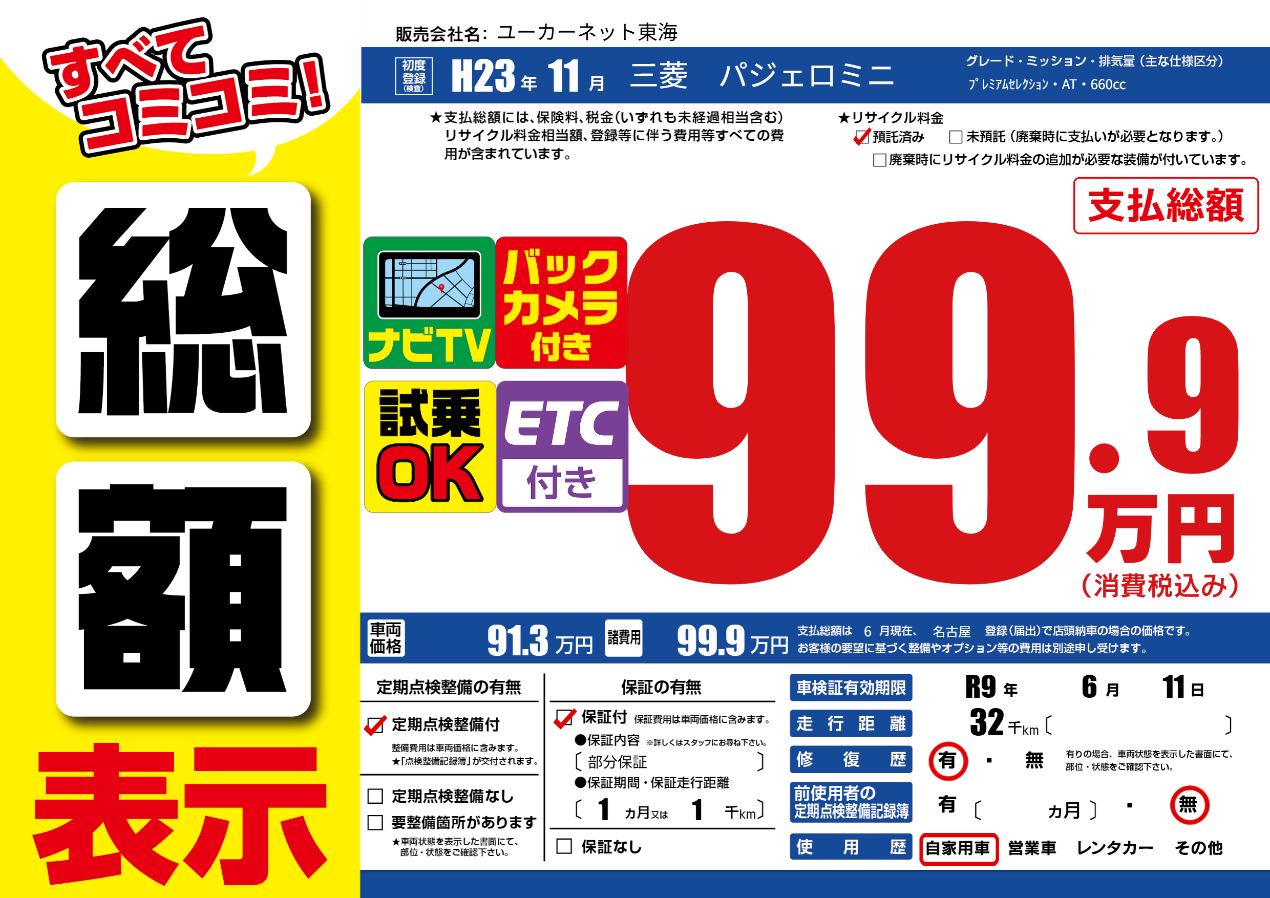| 車名 | 三菱 パジェロミニ | グレード ミッション 排気量 |