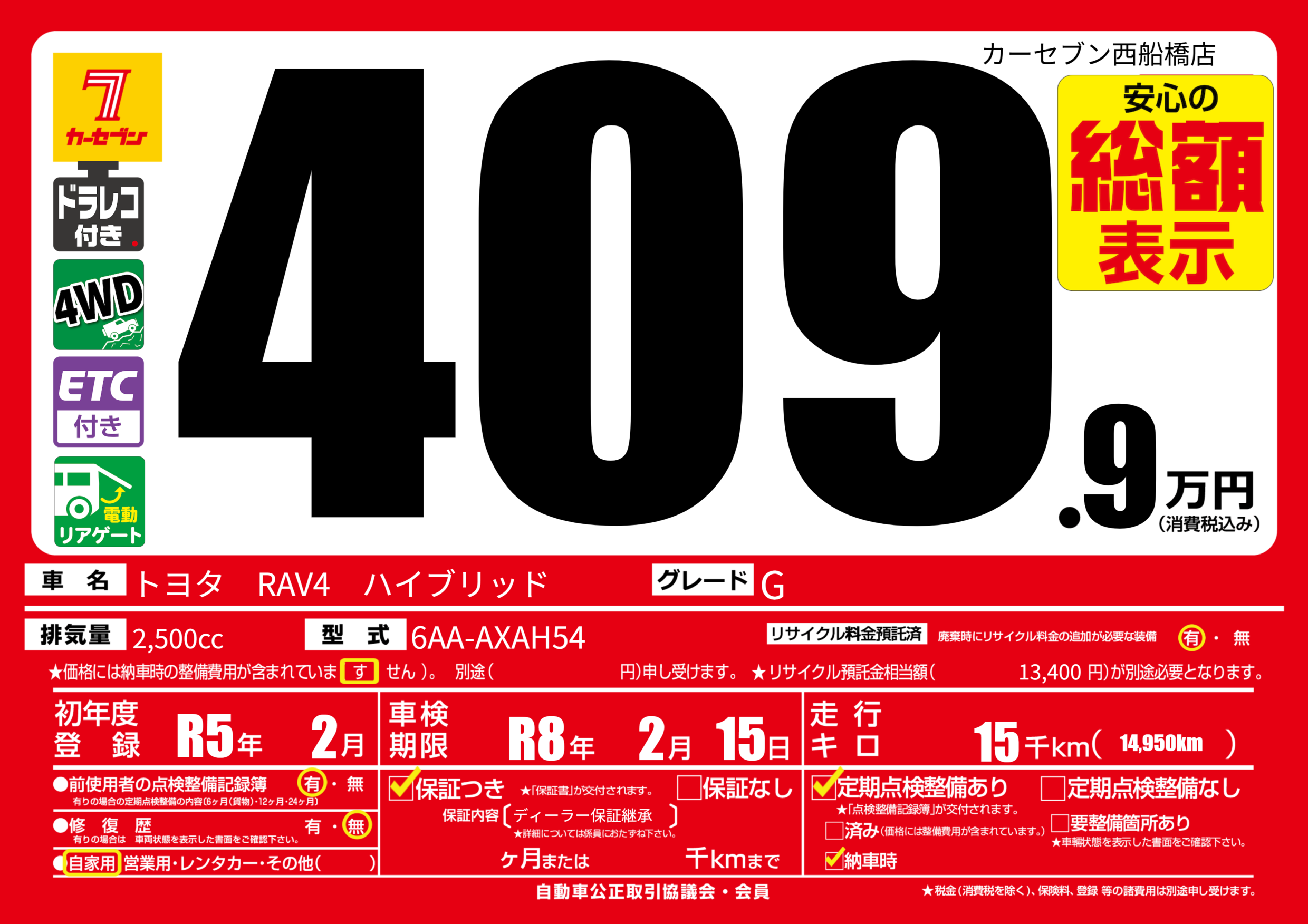 | 走行キロ | 1.5万km | 初年度登録 | R5年2月 |