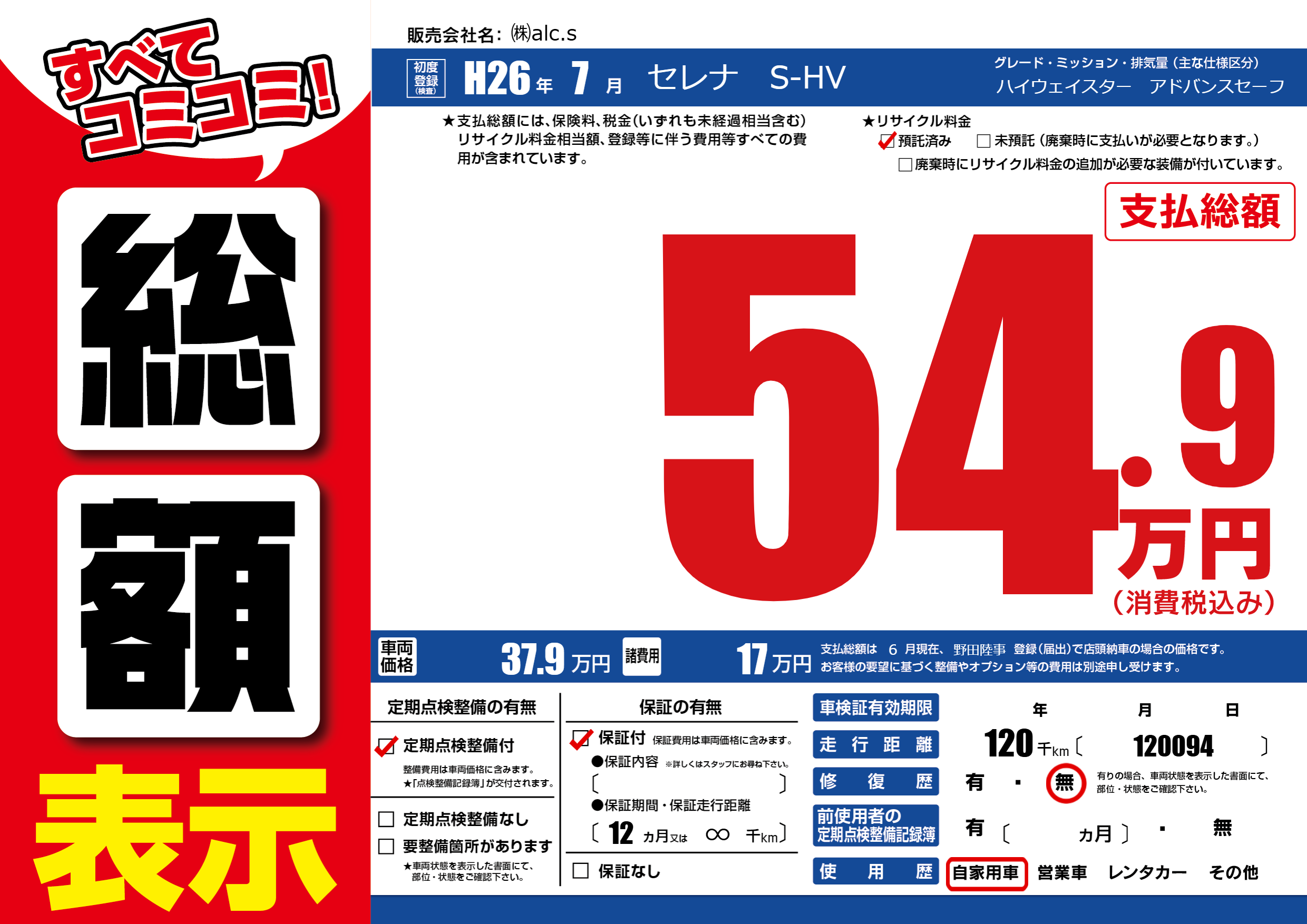 | 走行キロ | 12万km | 初年度登録 | H26年7月 |