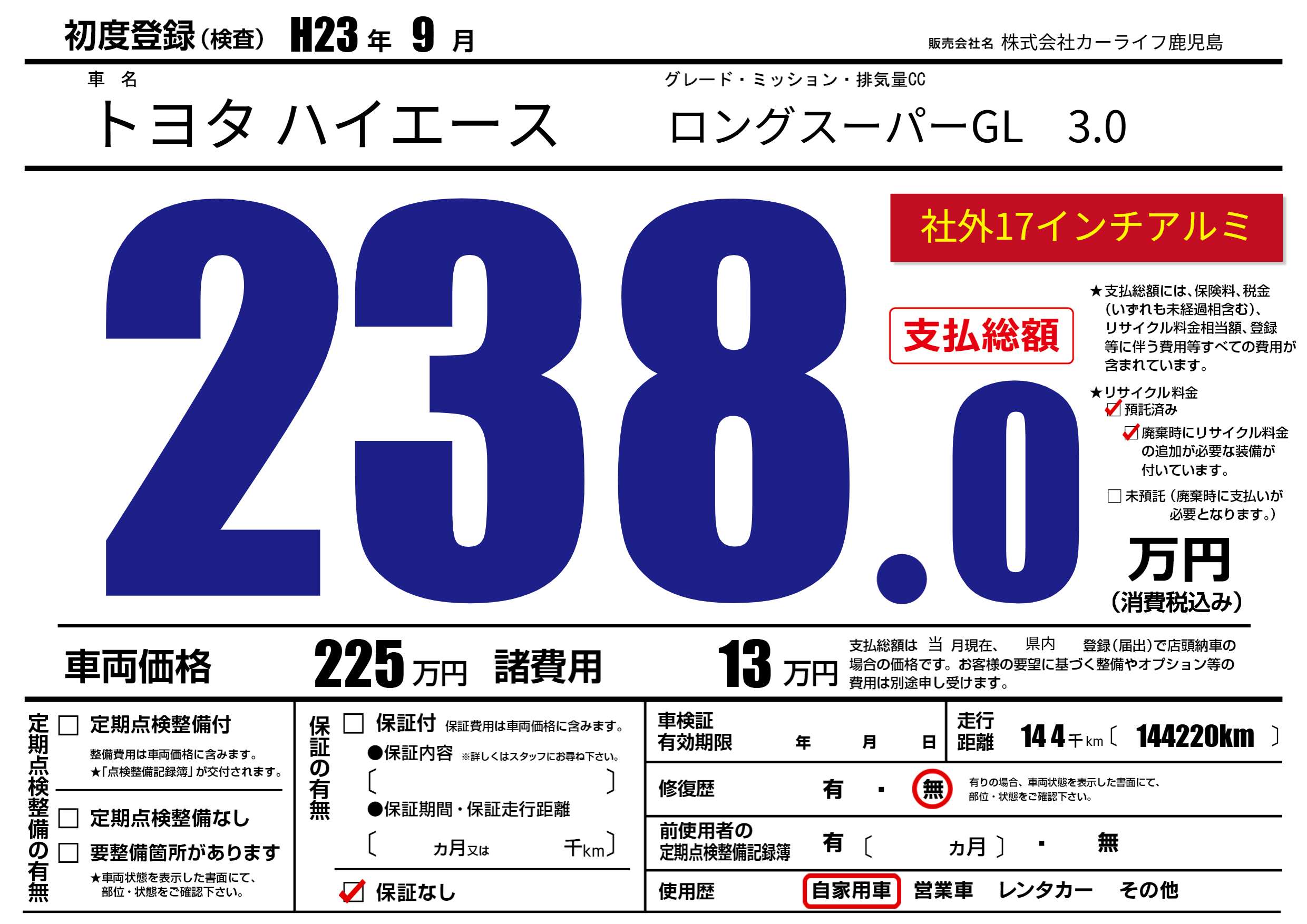 | 車名 | トヨタ ハイエース | グレード ミッション 排気量 |