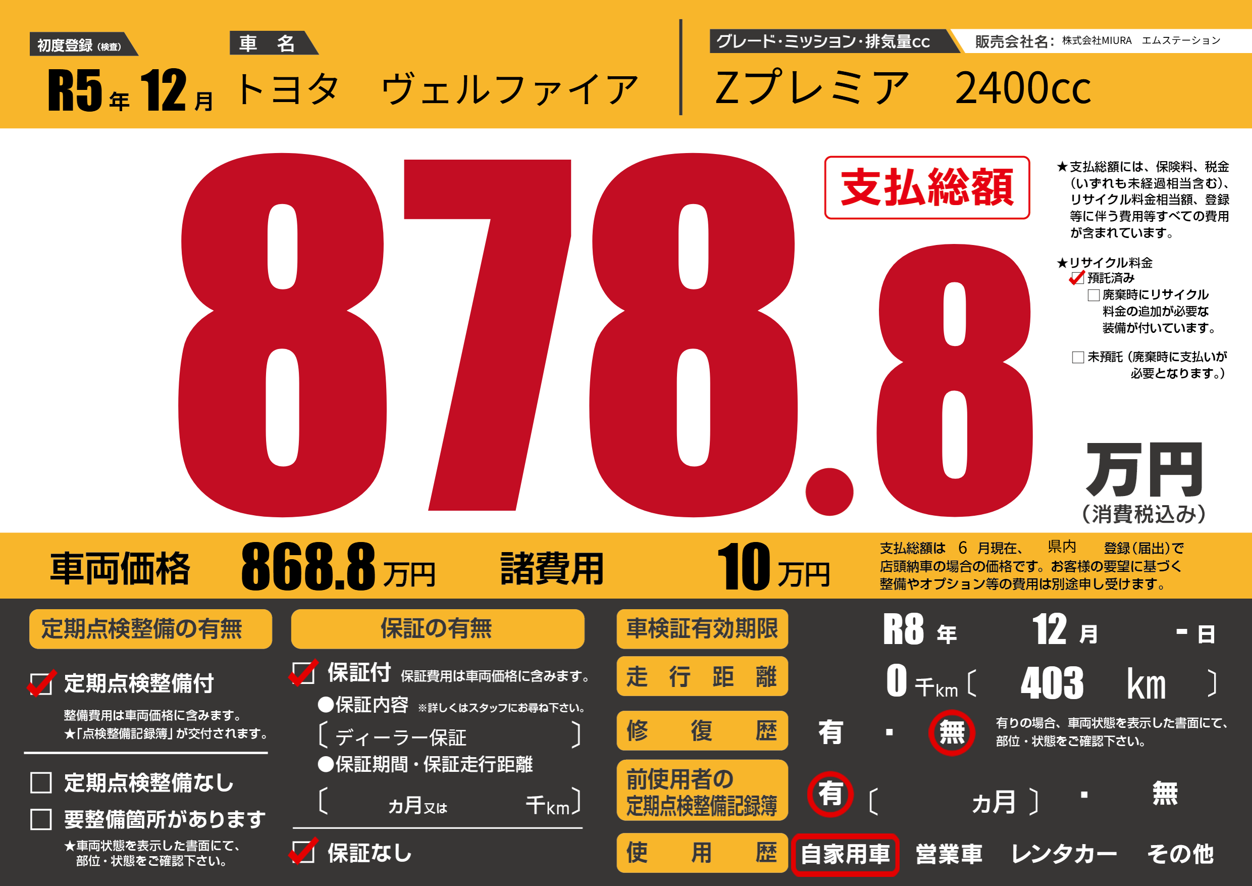 | 車名 | トヨタ ヴェルファイア | グレード ミッション 排気量 |