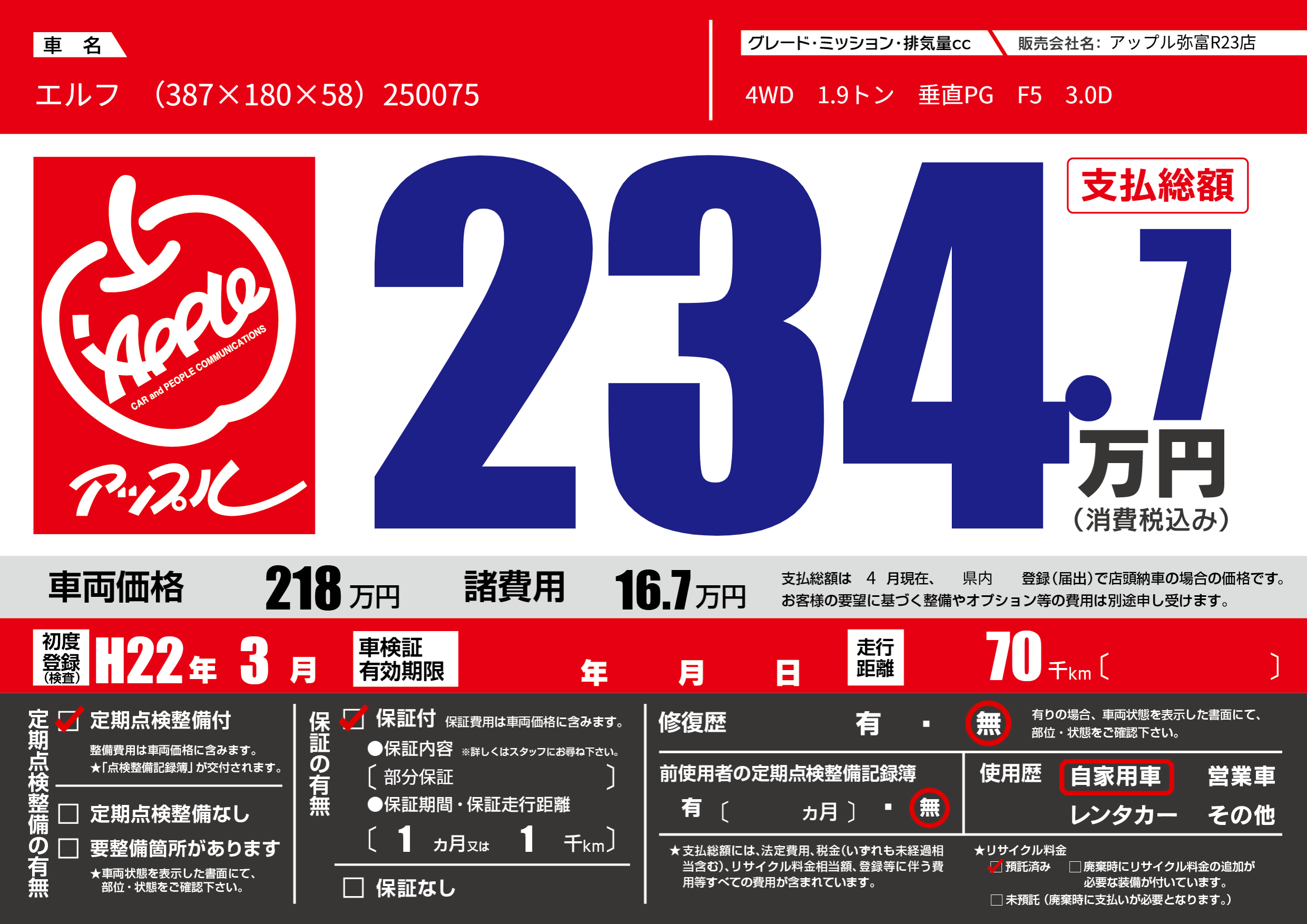 | 車名 | エルフ (387×180×58)250075 | グレード ミッション 排気量 |