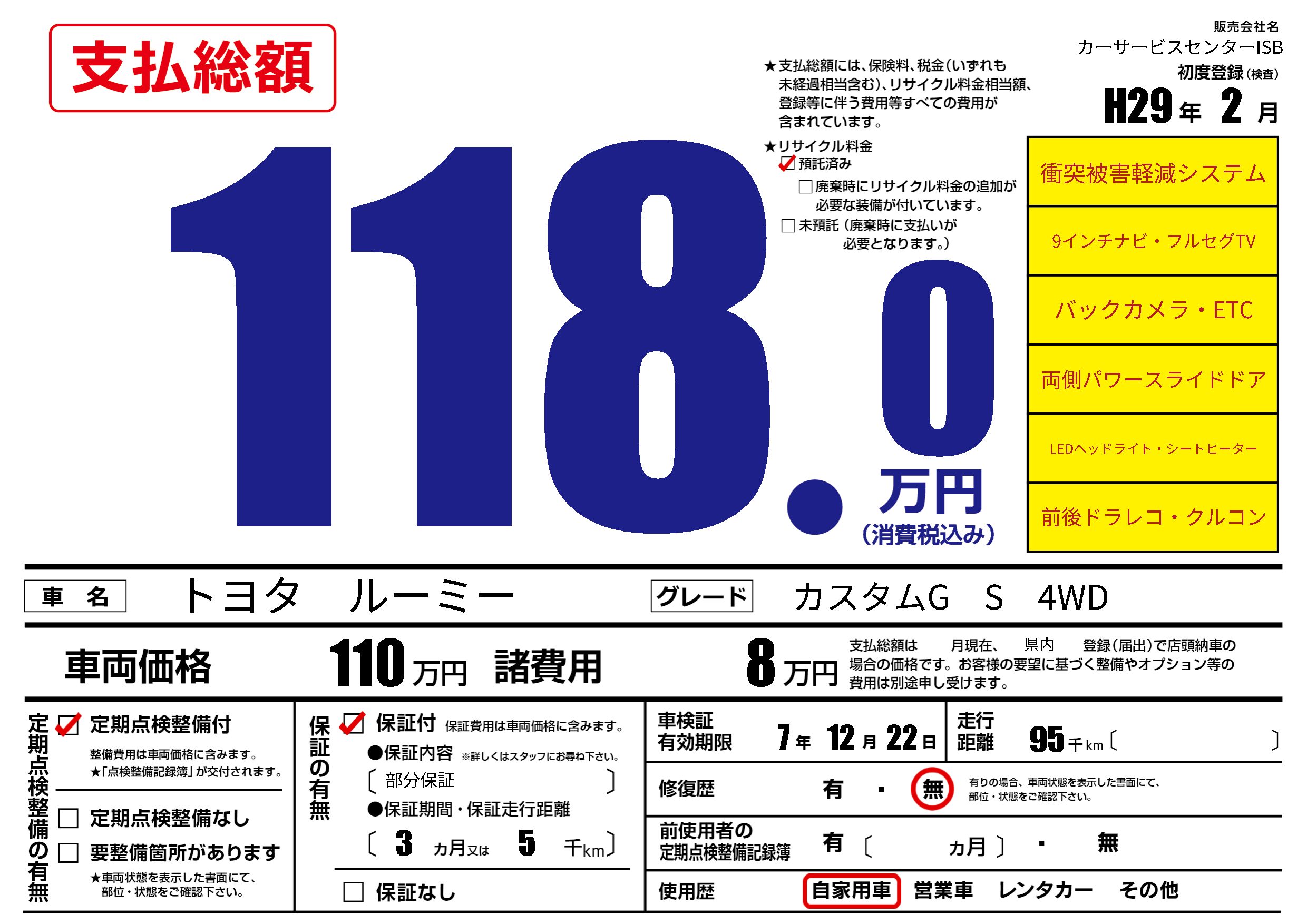 | 車名 | トヨタ ルーミー | グレード ミッション 排気量 |